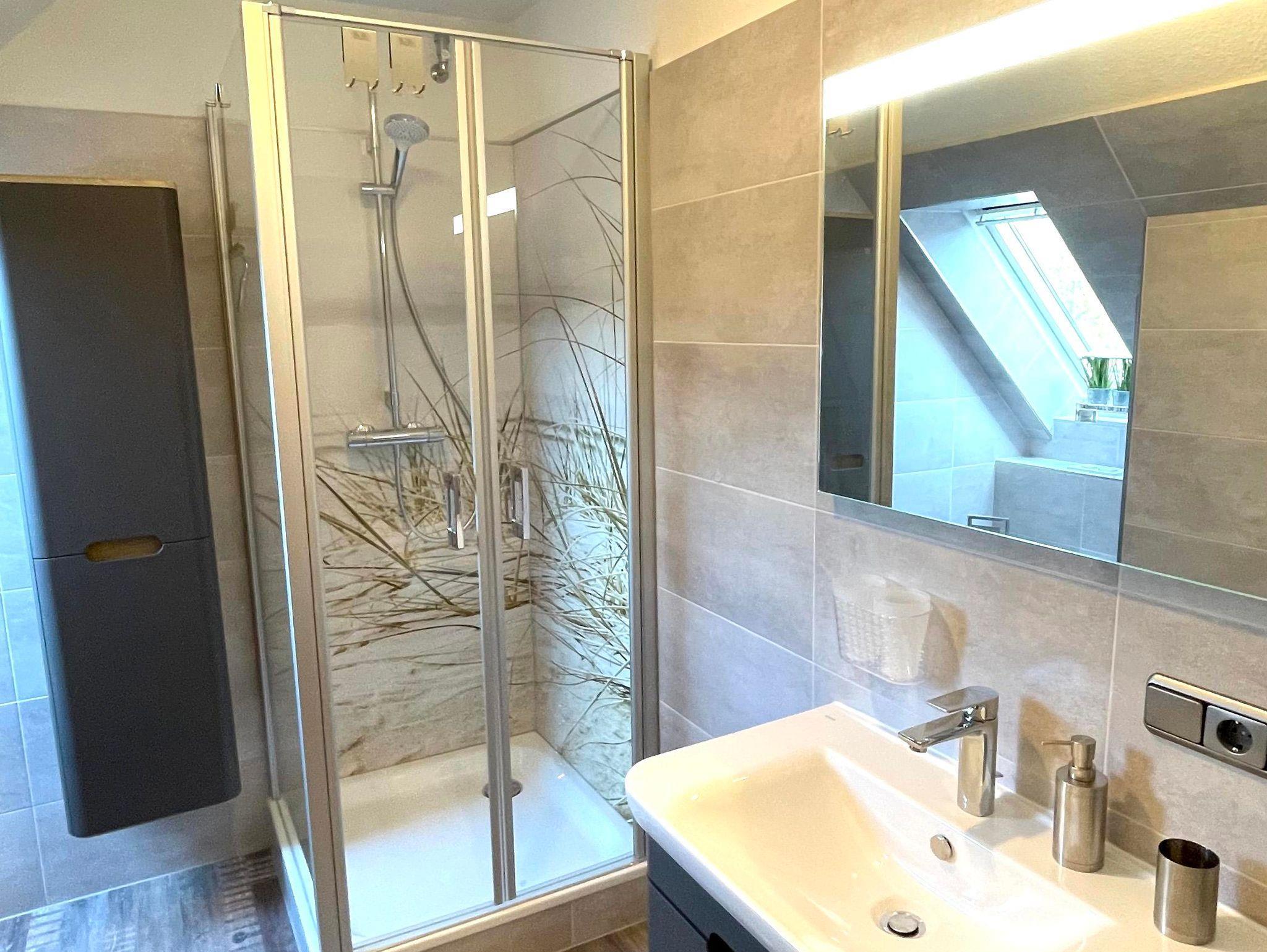 Bad: Dusche, Waschbecken, WC, Regal, Duschkabine