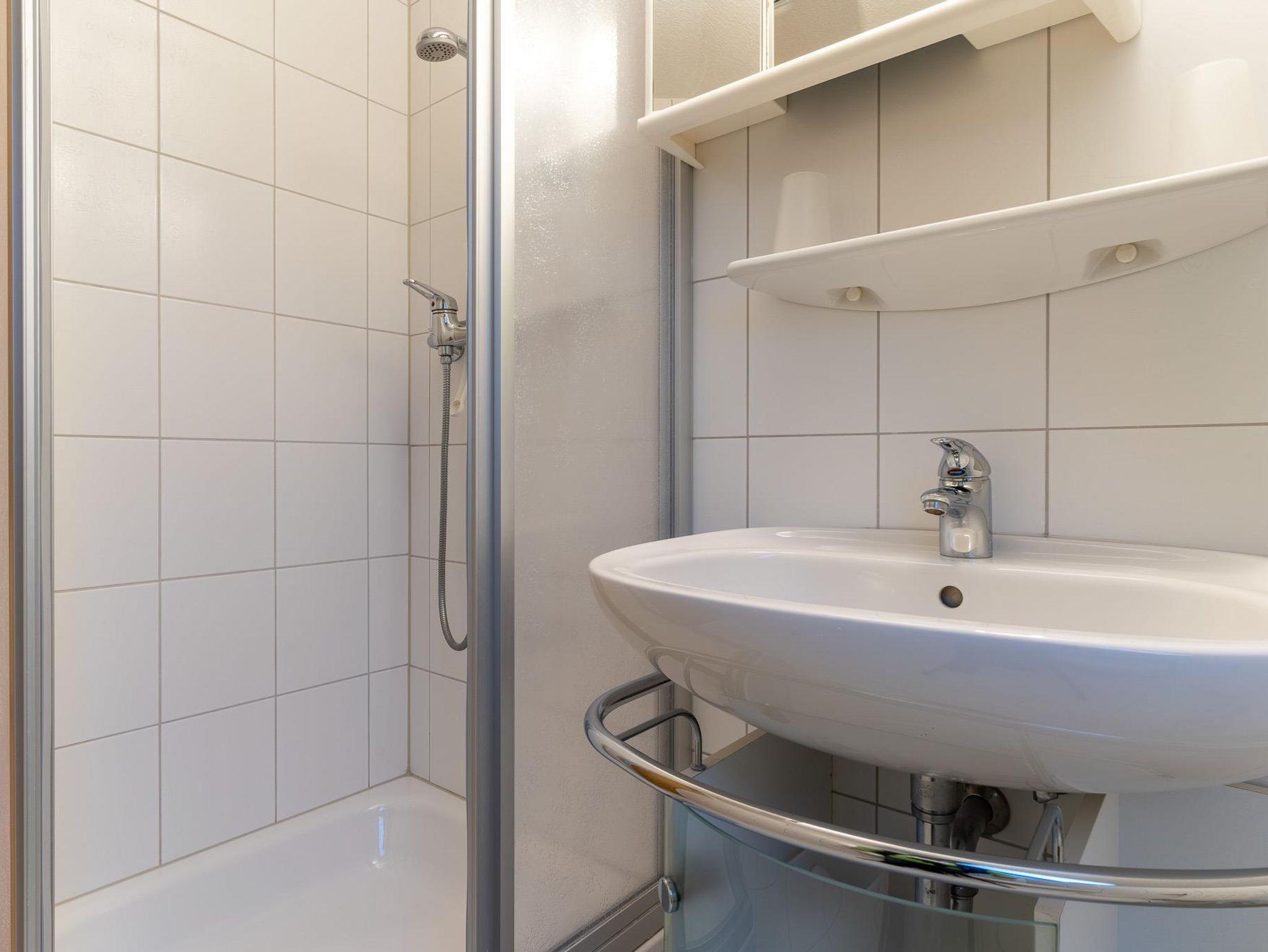 Bis jetzt wurde diese 2-Personen-Ferienwohnung nur privat genutzt. Man erreicht sie über eine fünfzehnstufige Treppe. Diese Wohnung auf der Ostseite des OG hat einen hellen und sehr großzügigen Hauptwohnbereich mit Küche und einem Balkon auf der Ostseite, sowie ein kleines Schlafzimmer und ein kleines Bad. Die offizielle Größe beträgt 45 qm, aber der Hauptwohnbereich wirkt groß, auch durch die bis unter den Dachfirst gezogene Decke. Der Balkon hat eine Fläche von knapp 8 qm. Der Wohnraum und der Essbereich mit der Küche beinhalten eine dreifenstrige Gaube, durch die viel Licht eindringt. Die Helligkeit der Wohnung wird durch den Fußboden (Buchenlaminat) noch weiter betont. Im Wohnraum befinden sich auch ein Flachbildschirm-Fernseher und eine Radioanlage. Die vollständig eingerichtete Küche verfügt neben der üblichen Ausstattung wie Herd und Backofen, Mikrowelle, Kühlschrank, Toaster, Wasserkocher, Eierkocher, Kaffeemaschine auch über einen Geschirrspüler. Das Schafzimmer ist klein mit zwei Einzelbetten (Liegefläche von je 90 X 200 cm). Das Badezimmer, in zurückhaltenden maritimen weißen Kacheln, beinhaltet Dusche, WC, und Waschbecken. Ein eigener PKW-Stellplatz ist direkt vor dem Haus vorhanden, und der Balkon steht zur Ihrer privaten Nutzung bereit. Bettwäsche und Handtücher sind einmalig inklusive. Ein Kinderhochstuhl und ein Kinderbett sind bei Bedarf verfügbar. Die Kosten für die Nutzung des WLAN-Zugangs zum Internet, Strom, Ölheizung und Wasser sind im Mietpreis enthalten. Die Benutzung der Waschmaschine und des Trockners im Hauswirtschaftsraum, der auch von den Gästen der anderen Wohnungen genutzt werden kann, erfolgt über einen Euromünzenautomat. Das Mitbringen von Haustieren und das Rauchen sind in der Wohnung nicht gestattet. Die Mindestmietdauer beträgt 7 Übernachtungen. Bei Buchungen von 5 und 6 Übernachtungen wird ein Kurzbucherzuschlag i.H.v. einmalig 9,50 € pro Person erhoben.