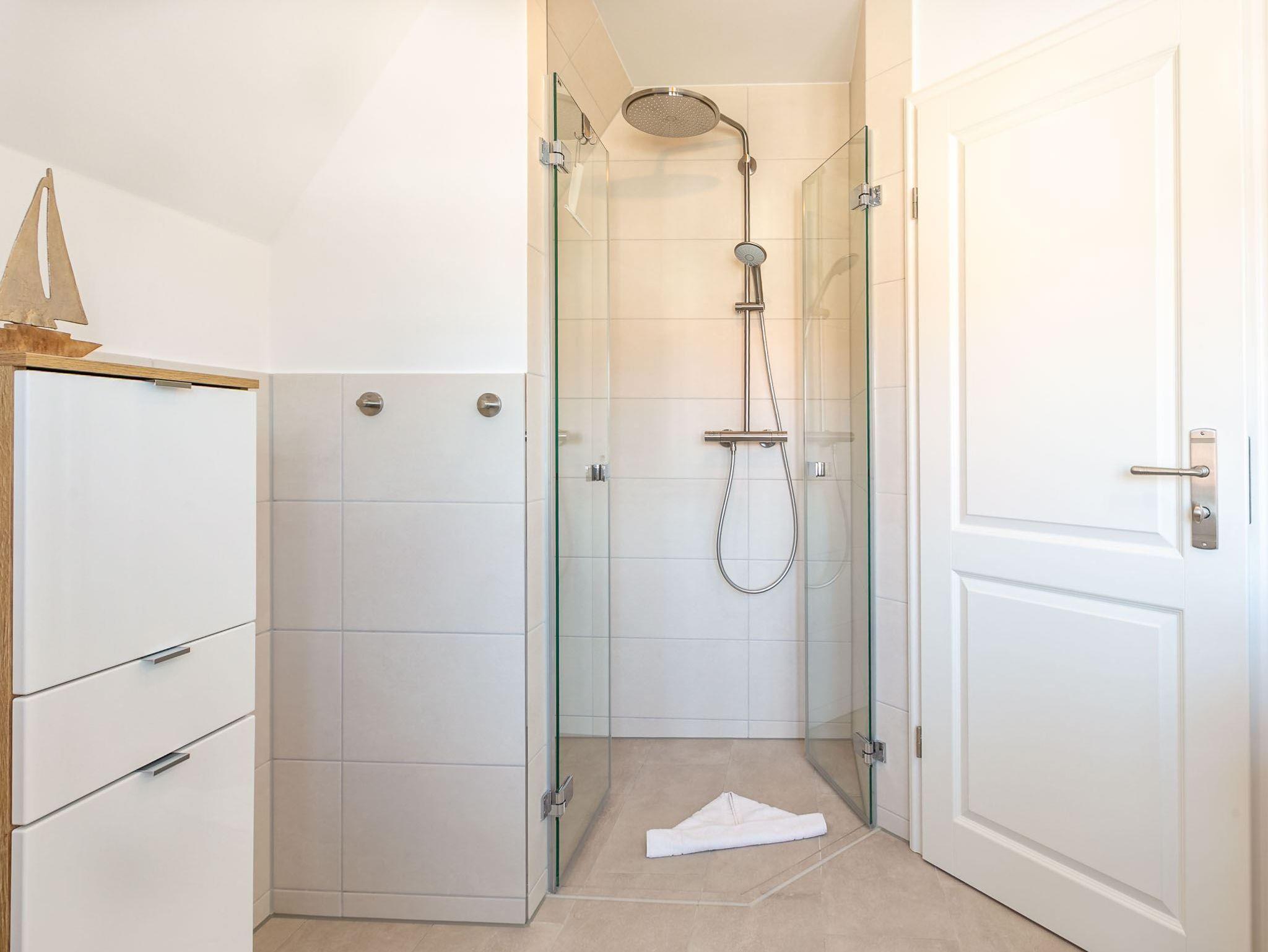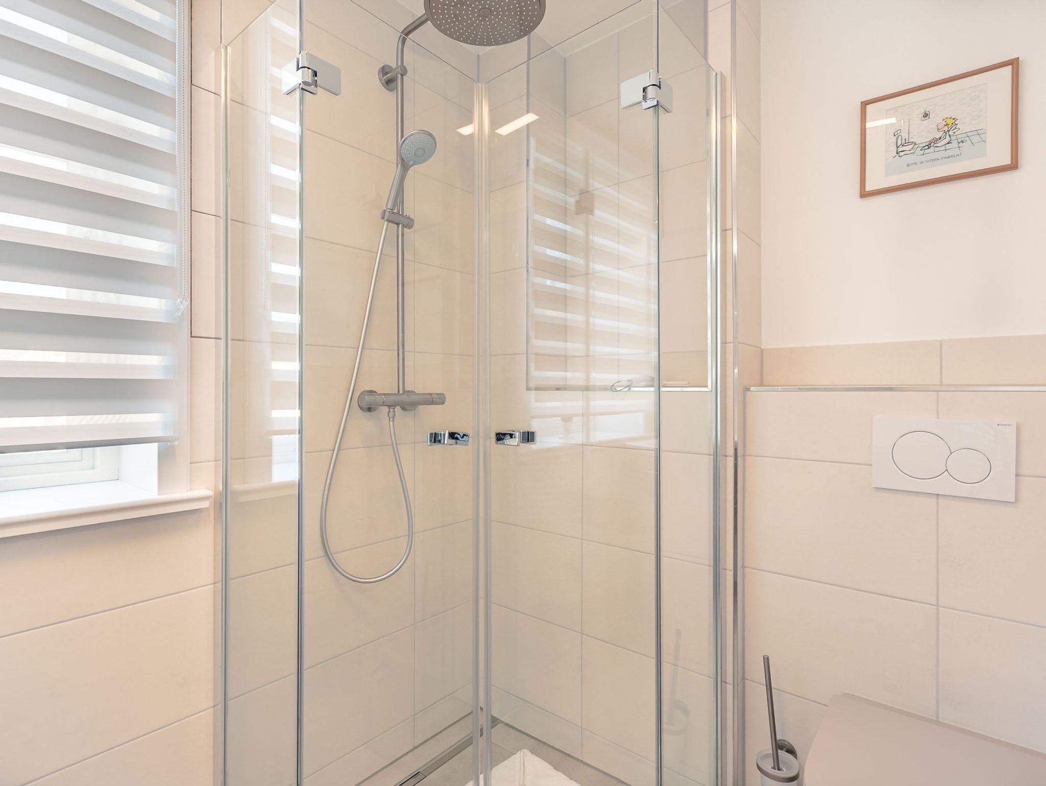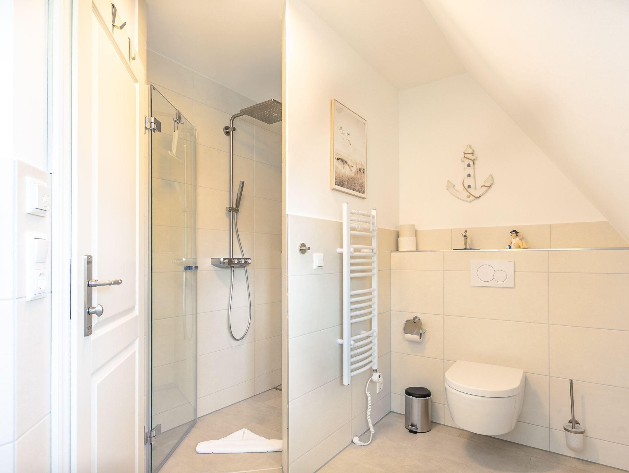 Vier Bäder mit ebenerdigen Regen-Duschen, WC und Handtuchwärmern.