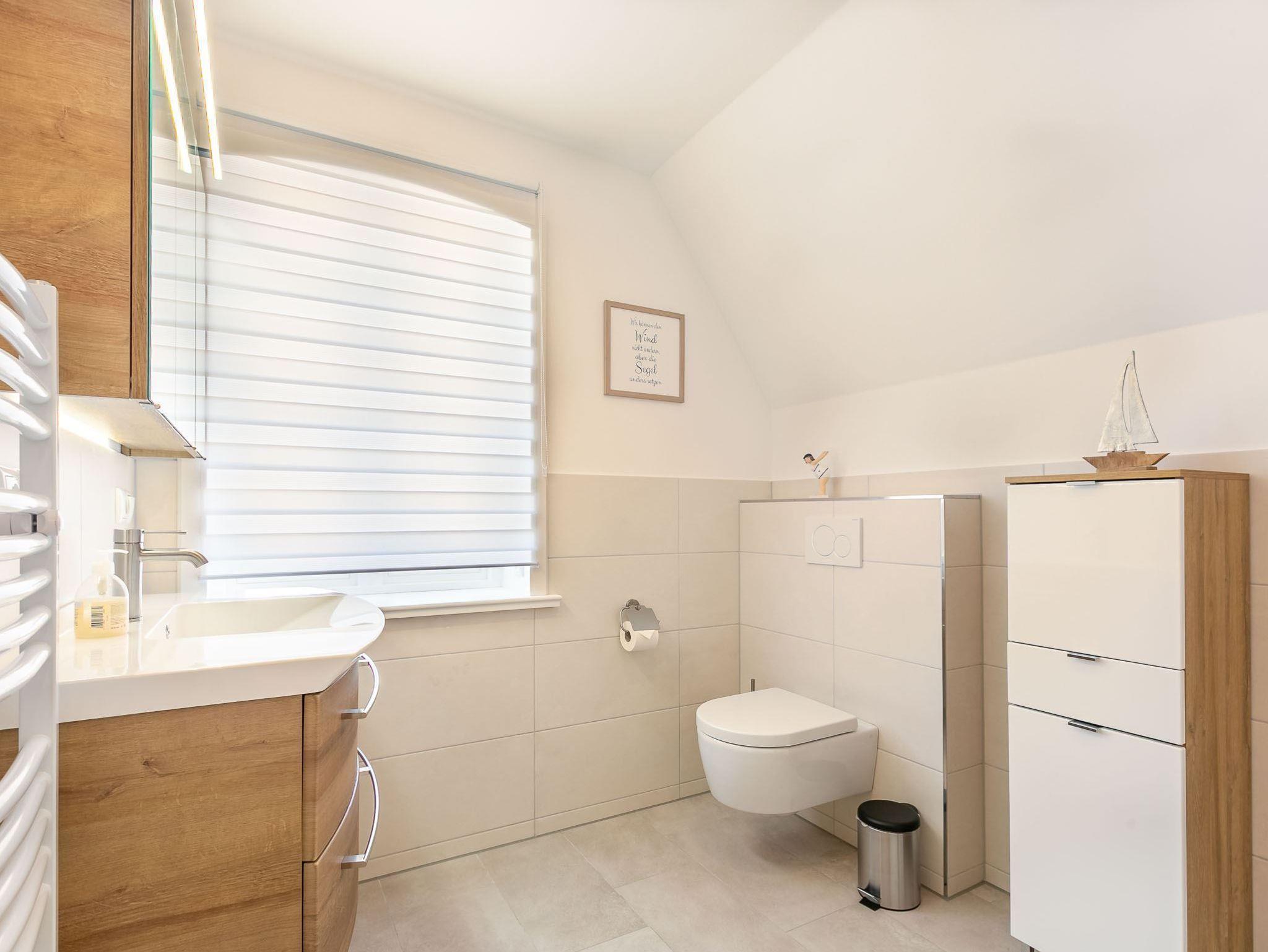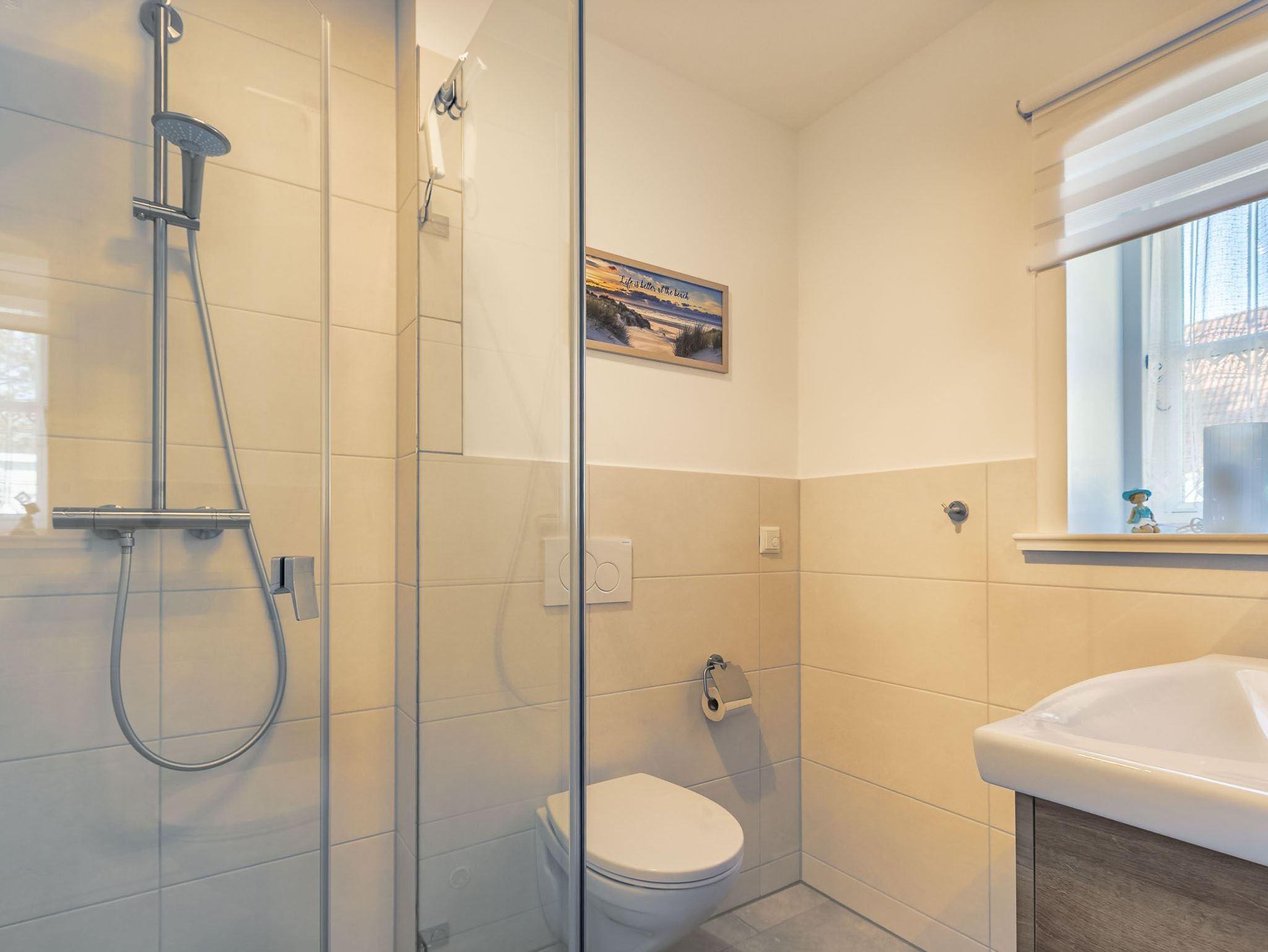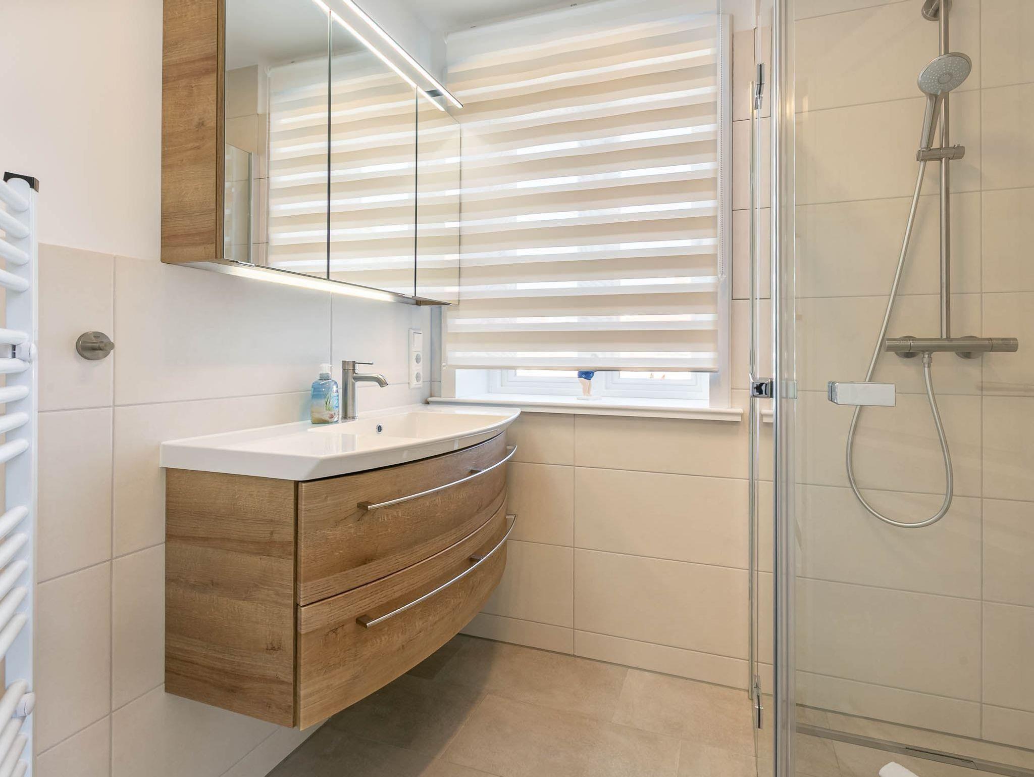 Vier Bäder mit ebenerdigen Regen-Duschen, WC und Handtuchwärmern.