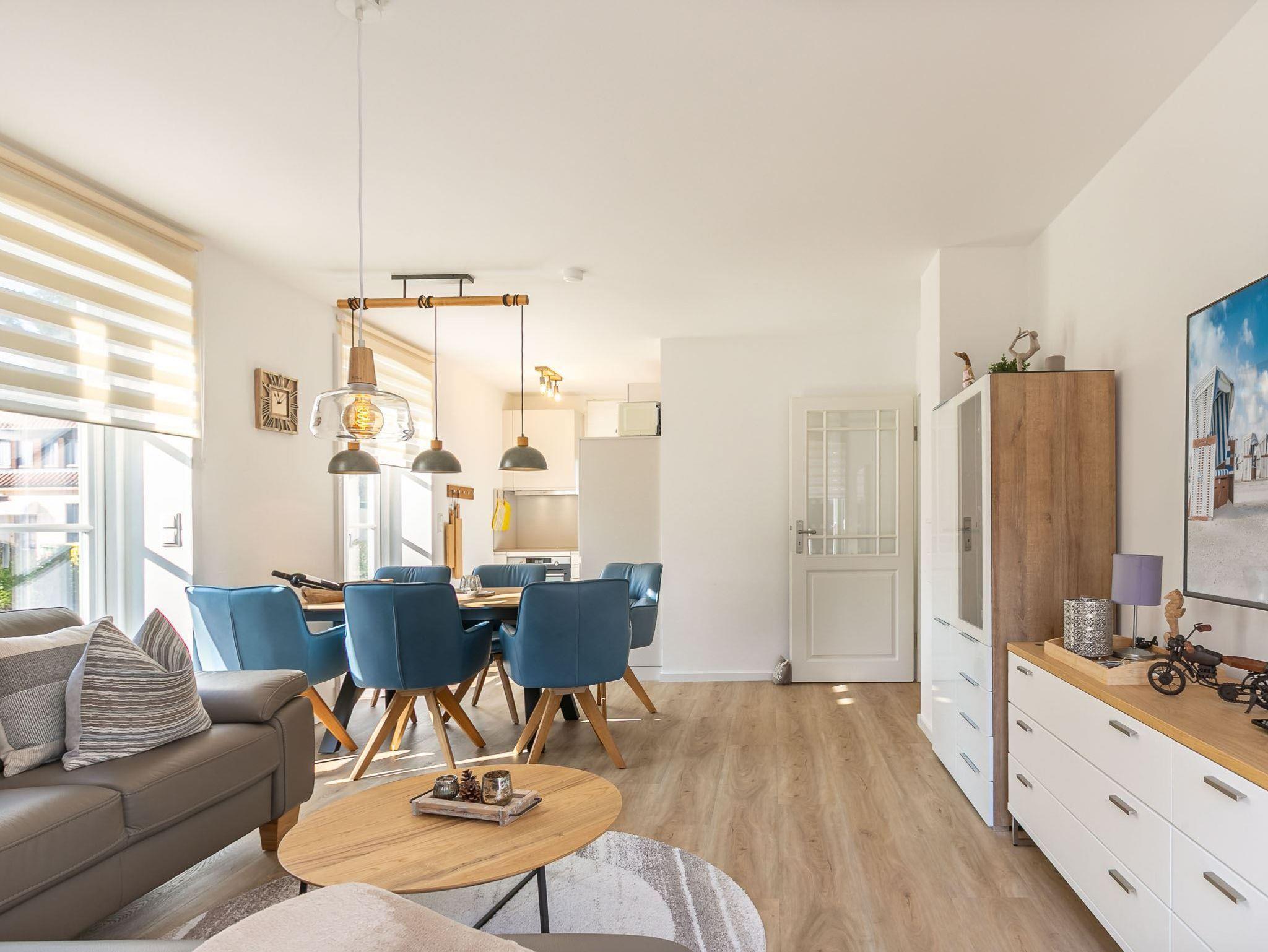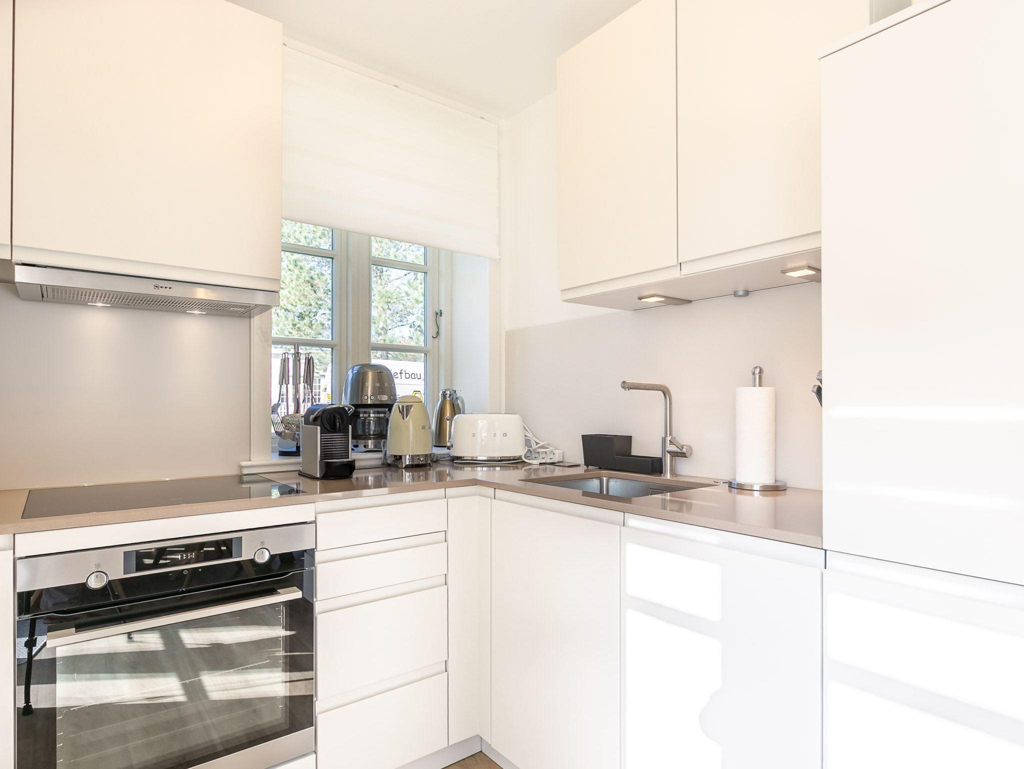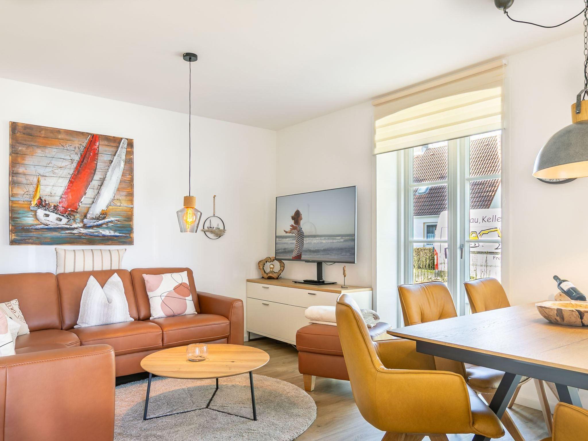 Das stilvoll eingerichtete Domizil bietet zwei Wohnzimmer mit Lederecksofas, SMART-TVs (Waipu) und großzügigen Essbereichen. Die offenen Küchen sind hochwertig ausgestattet, u. a. mit Backofen, Mikrowelle, Geschirrspüler und Krups Nespresso Kapselmaschinen.