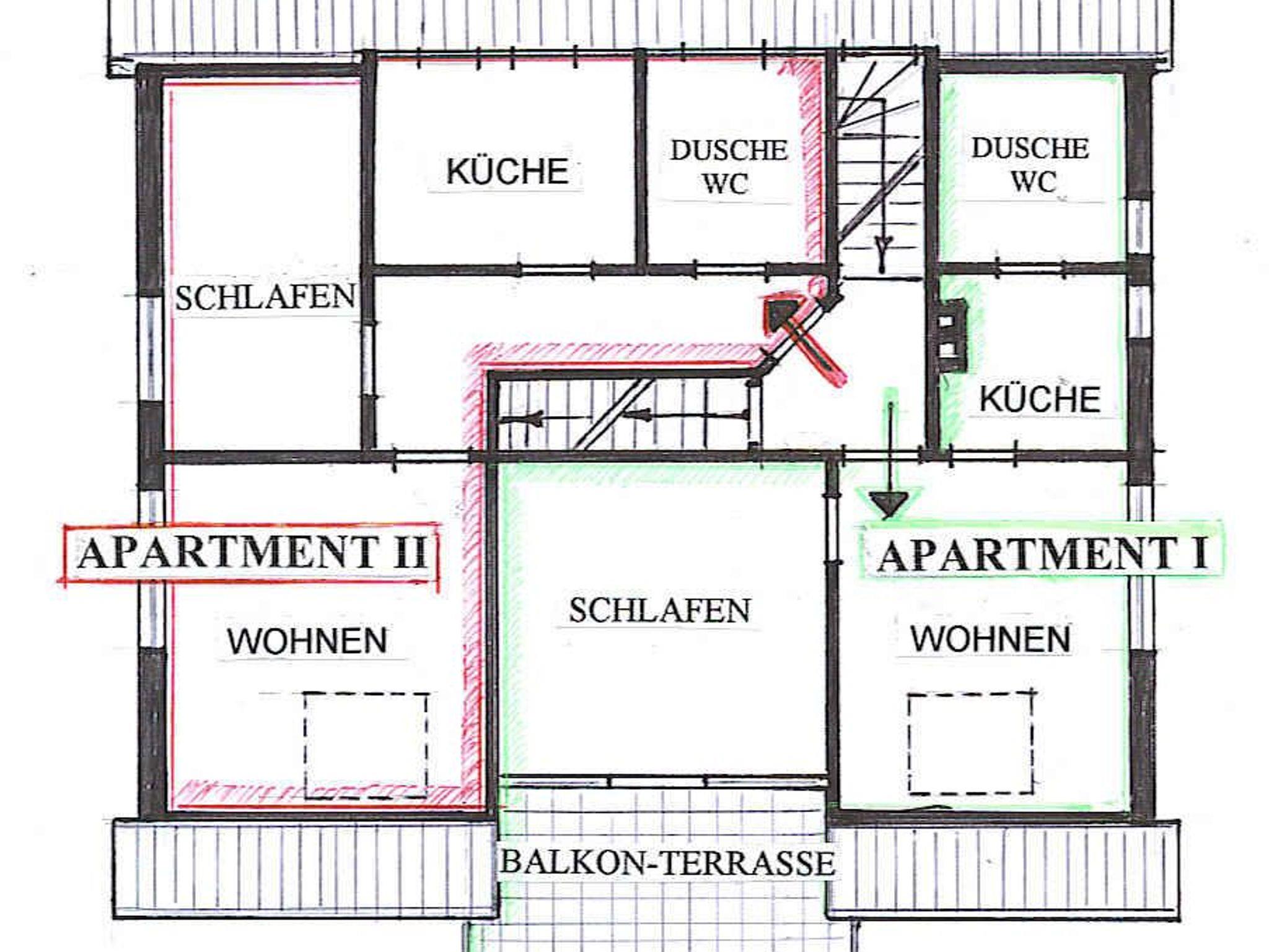 Im ersten Obergeschoss sind zwei Apartments. Das Apartment 1 ist ca. 38 m² groß. Es besteht aus einem Wohn-Esszimmer, einem Schlafzimmer, Küche und Bad. Zu diesem Apartment gehört ein großer Terassenbalkon zur sonnigen Süd-Westseite. Das Apartment ist komfortabel ausgestattet: Einbauküche mit Spülmaschine, Kochfeld und Mikrowelle; Duschbad, Föhn und Kosmetikspiegel; im Wohnzimmer Schlafcouch, Kabel-TV, WLAN Internet-zugang, Radio mit CD-Player; Balkonmöbel. Kinderbett und Hochstuhl werden auf Wunsch bereit gestellt. Die Wohnung ist sehr gut für zwei Personen geeignet oder auch für zwei Erwachsene mit einem Kind. Eine Belegung mit 4 Personen empfehlen wir nicht.