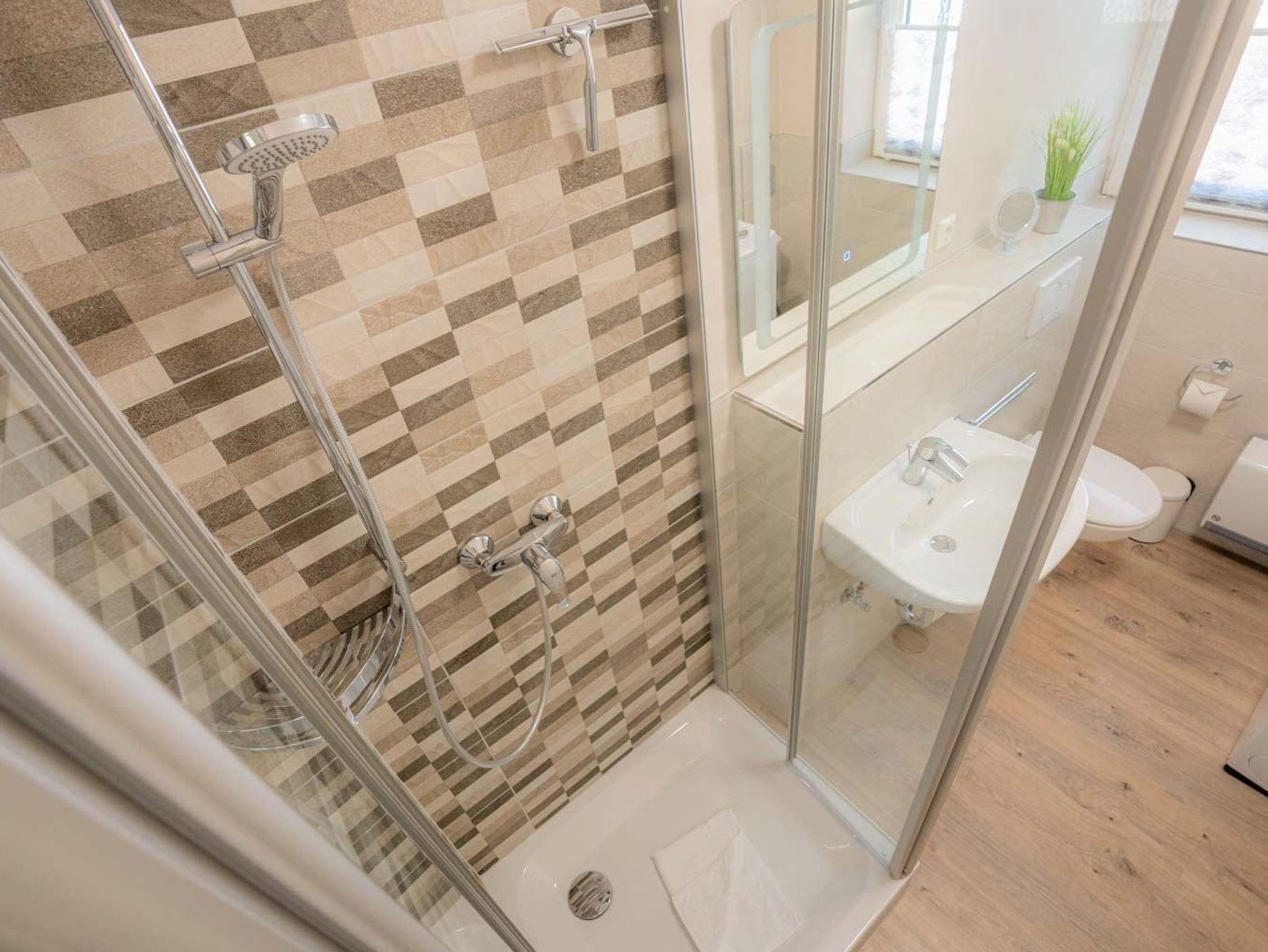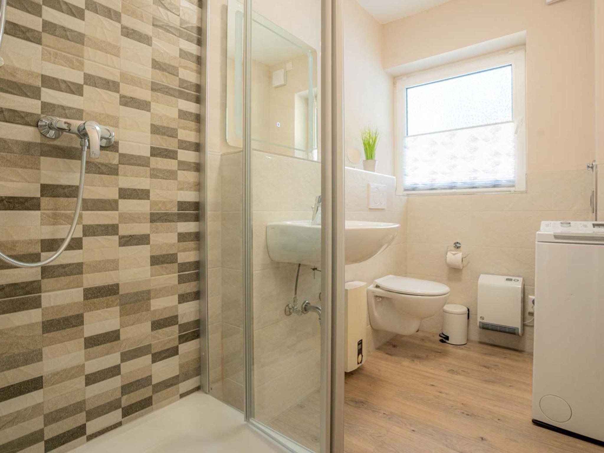 Badezimmer (Duschbad) mit Dusche, WC, Waschmaschine (TopLoader), Föhn und Tageslicht.