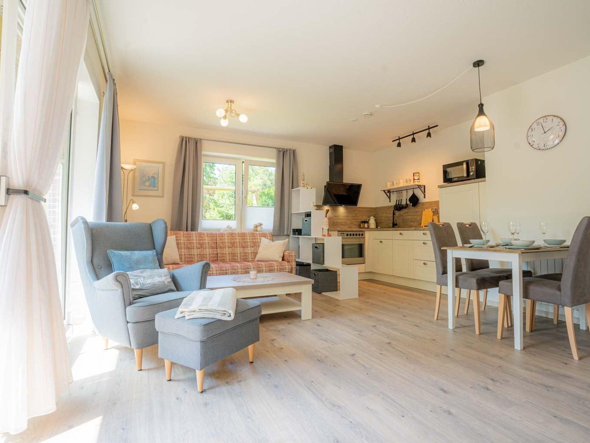 Wohnzimmer mit (ausklappbarem Schlaf-) Sofa (160x200cm), bequemem Ohrensessel mit Fußhocker, SMART-TV (Kabel), Bluetooth-Soundanlage mit CD-Player und Esstisch mit 4 Stühlen. Direkter Zugang zur möblierten Gartenterrasse nach Süden. Halboffene Küche mit Backofen, Mikrowelle, Geschirrspülmaschine und Kühlschrank mit Gefrierfach.