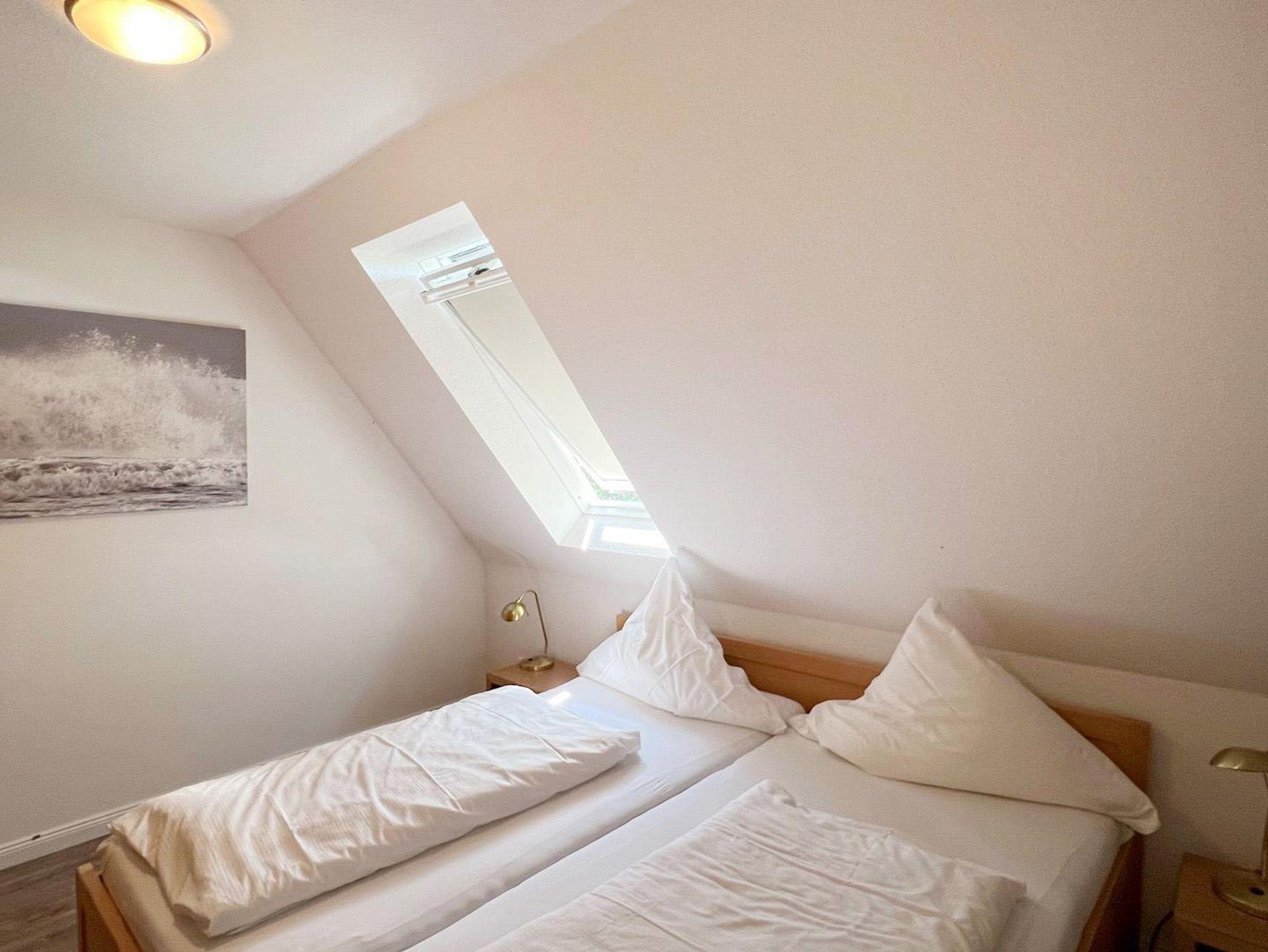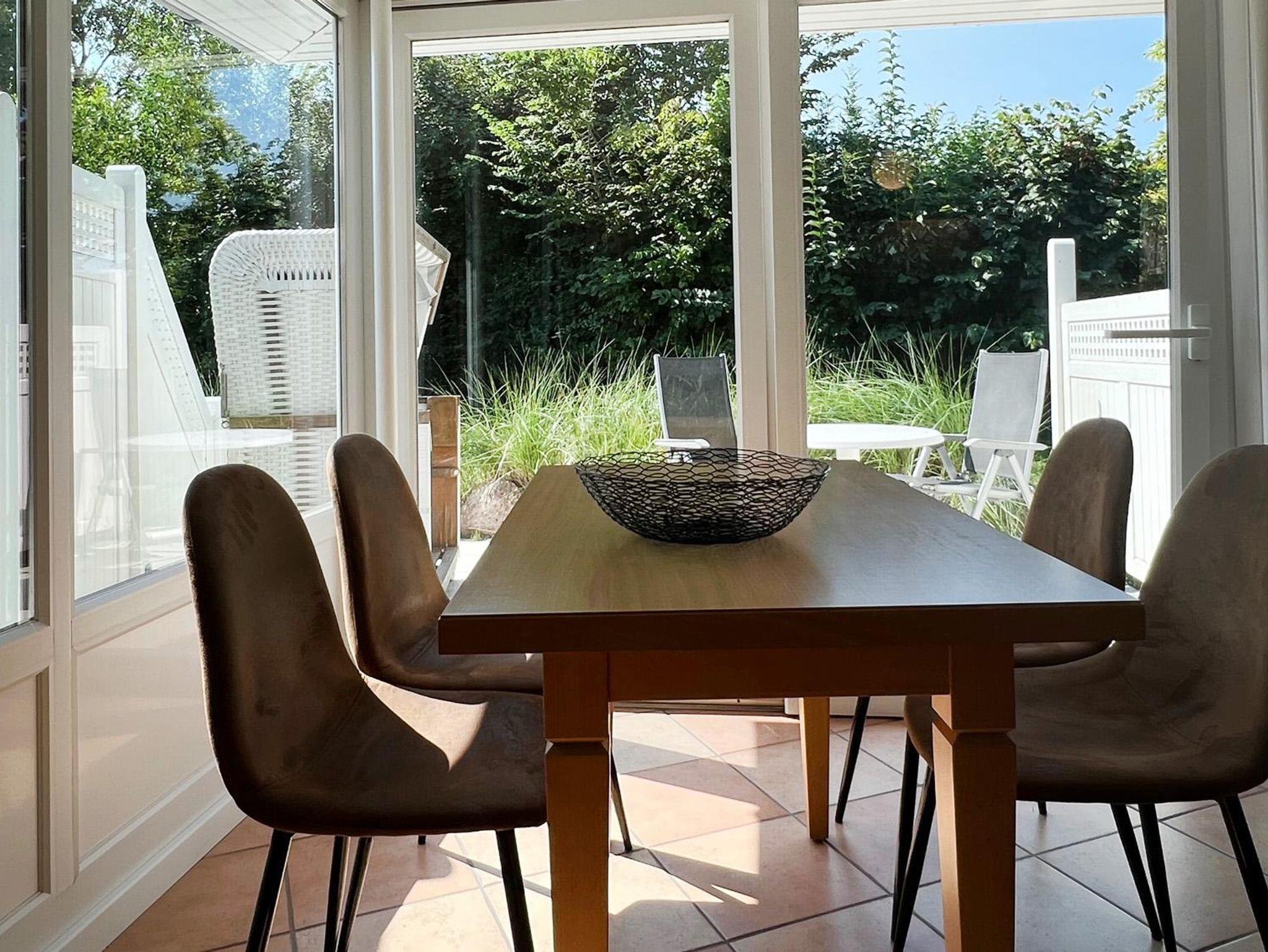 Im Erdgeschoss befindet sich die Eingangsdiele mit einer gradläufigen Treppe nach oben zu den beiden Schlafzimmern.1 Schlafraum mit Doppelbett 180x200cm mit getrennten Matratzen, ein Schlafraum mit 2 Einzelbetten (90x200cm). Das Zustellen eines Kinderreisebettes oder Hochstuhles ist kein Problem. Abgehend von der Eingangsdiele, der Wohn-Essraum mit voll ausgestatteter Küchenzeile, gemütlicher Sitzecke und Essecke im raumhoch verglasten Wintergarten, direkter Zugang zu einer, mit einer kleinen Sanddüne eingefassten Terrasse und Garten. Das Duschbad ist komplett neu in 2018, ausgestattet mit begehbarer Dusche, WC, Waschbecken und Außenfenster.