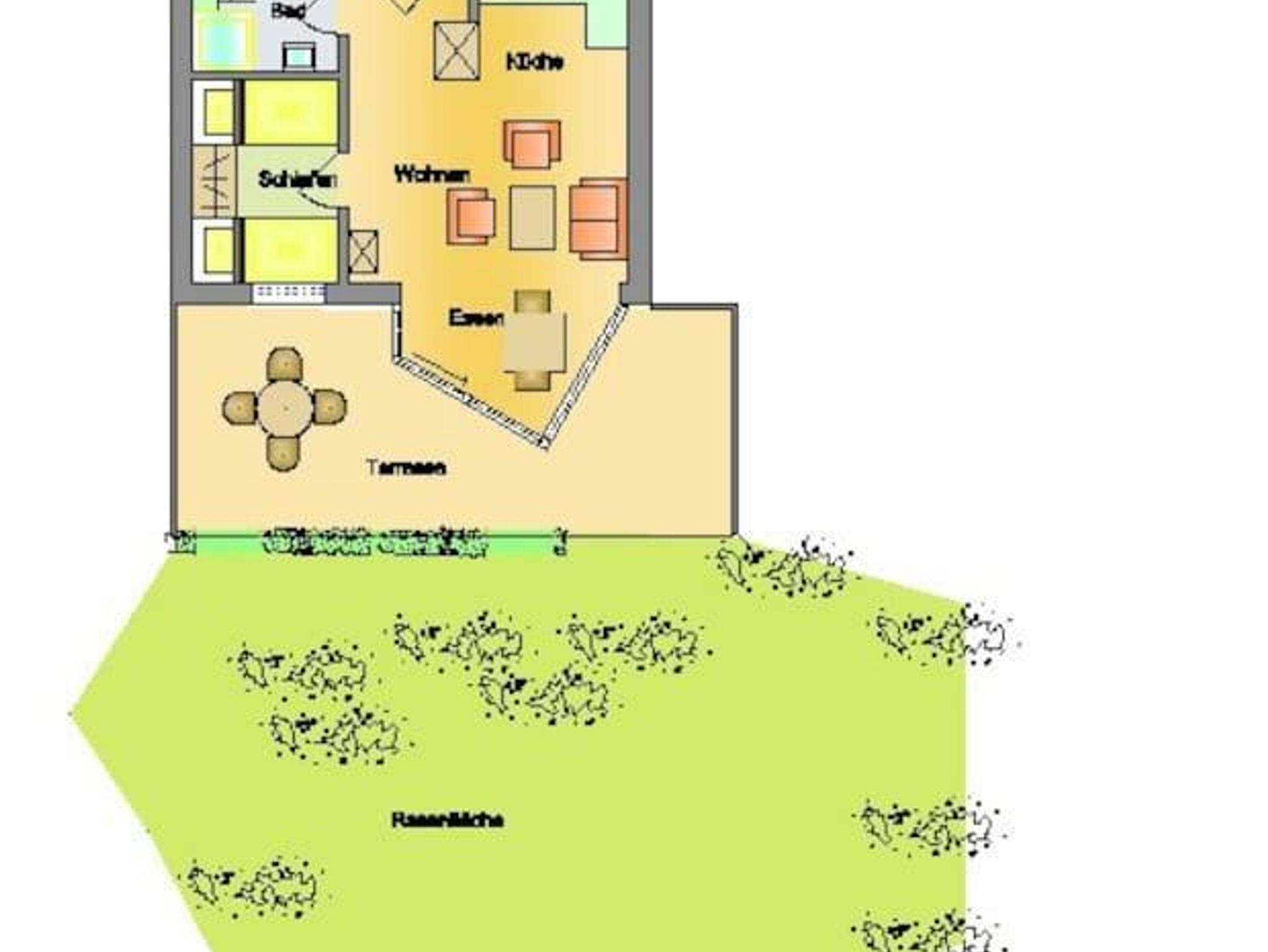 Eingangsbereich mit Garderobe, offene Küche zum Wohnraum mit Essbereich in einem vorgelagerten Wintergarten, direkter Zugang zur Terrasse und Garten, Schlafzimmer mit 2 Einzelbetten (90x200cm), 1 Duschbad mit WC und Waschbecken. Parkplatz und Fahrradständer sind vorhanden.
