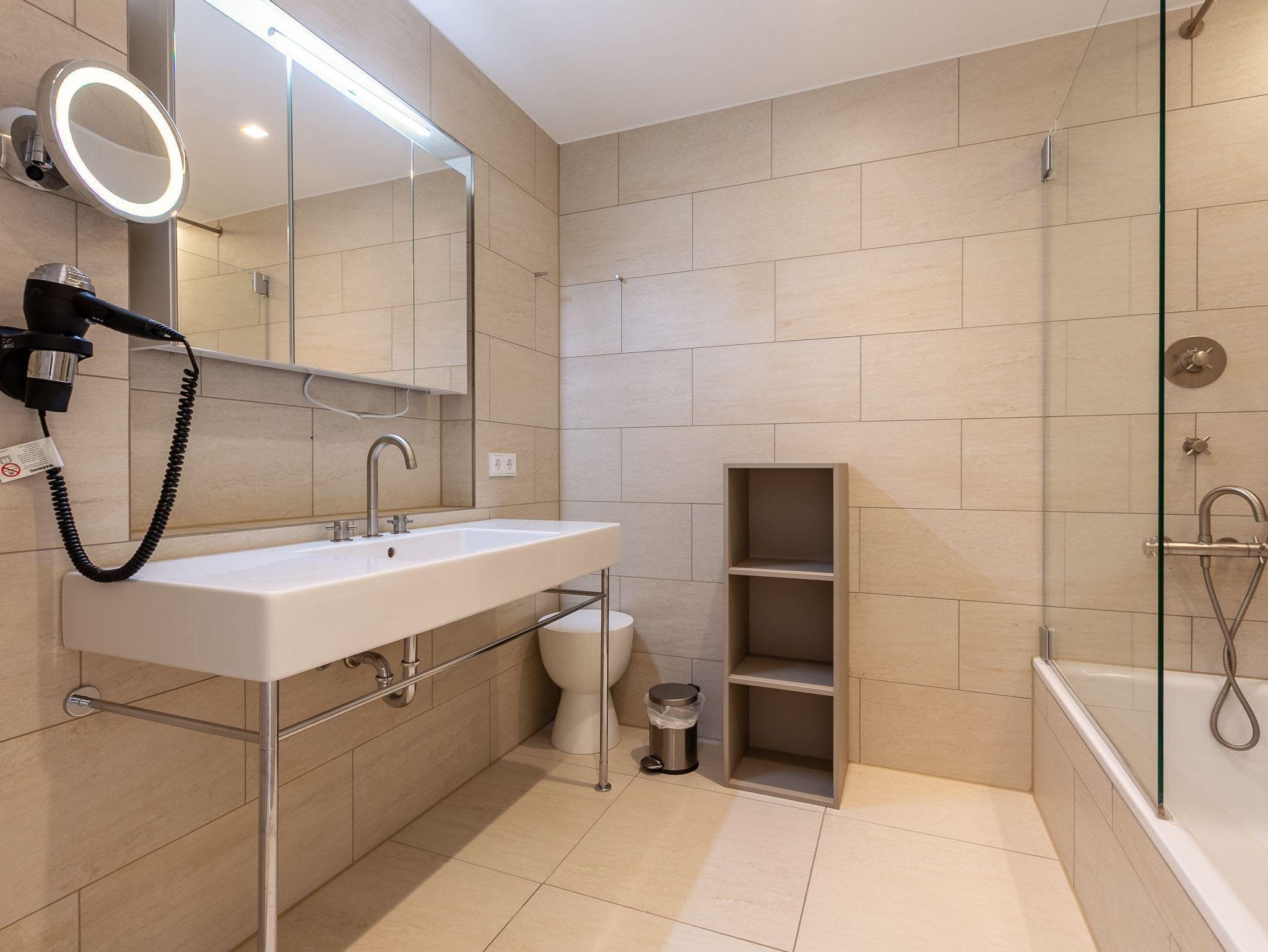 1. Badezimmer (Duschbad) mit Regendusche, WC, Handtuchwärmer und Föhn.