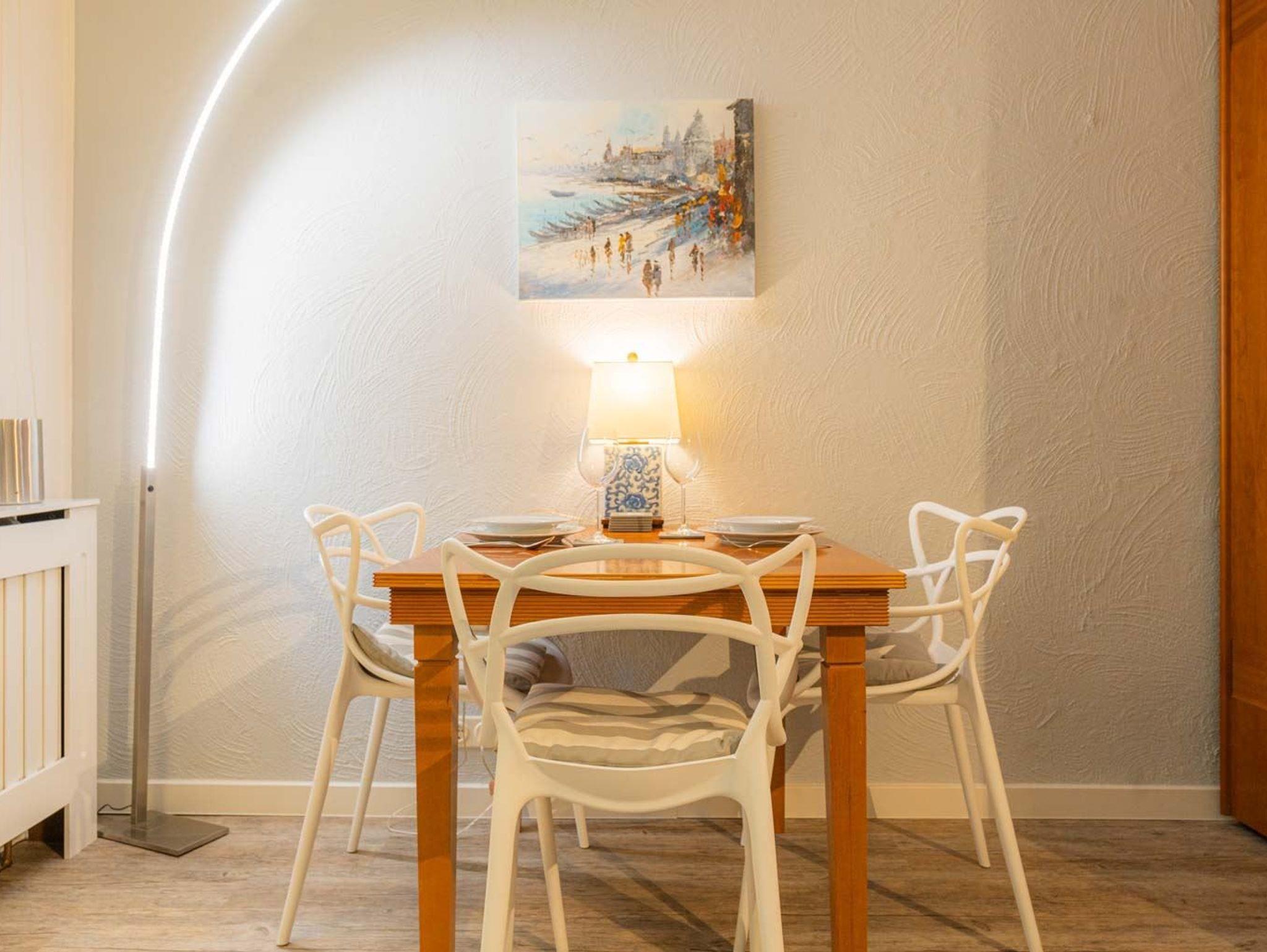 Wohnzimmer mit ausklappbarem (Schlaf-) Sofa (140x190cm), Sessel, großem TV (Kabel), Sony Playstation 3, Bluetooth-Lautsprecher von Marshall, Kleiderschrank und Esstisch mit 3 Stühlen. Direkter Zugang zum möblierten Balkon nach Südwesten mit Ausblick auf das Kurwäldchen. Offene Küche mit Herd mit 2 Kochstellen, Mikrowelle mit Grillfunktion, Geschirrspüler und Kühlschrank mit Gefrierfach.
