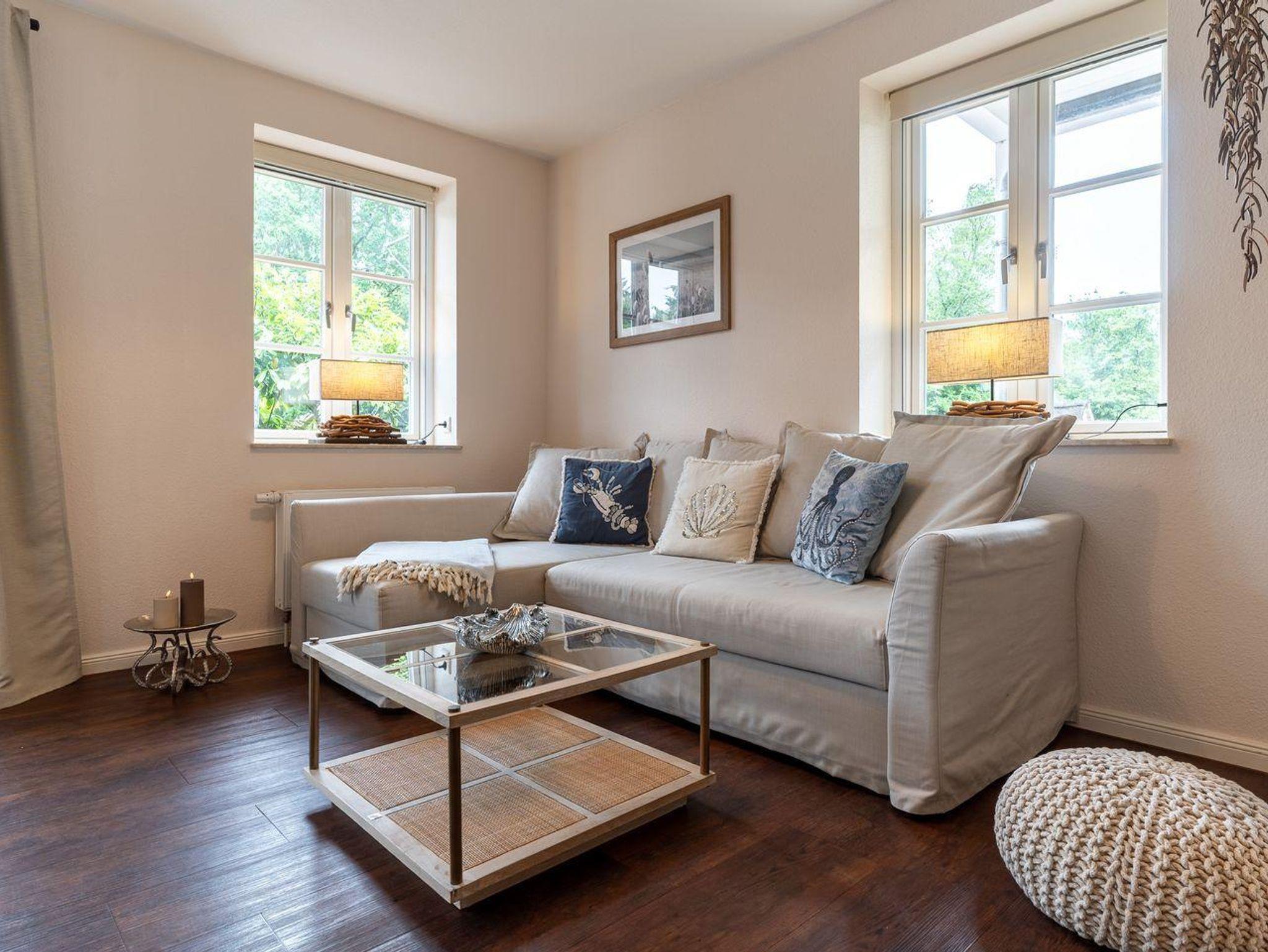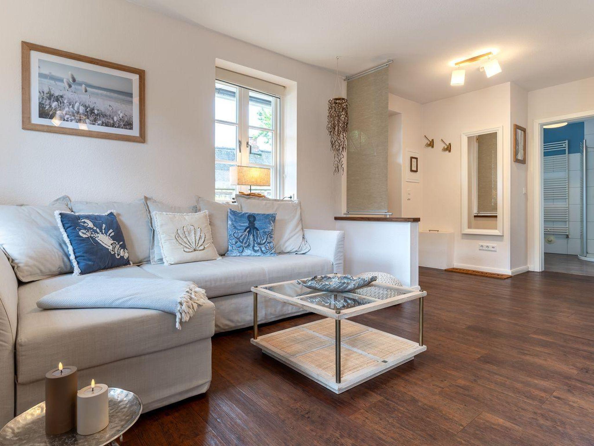 Mit Aussicht auf die eigene Terrasse mit Süd- Westlage, einer Rasenflächen und Ihrem Strandkorb können Sie die Zeit in als auch außerhalb der Wohnung genießen.