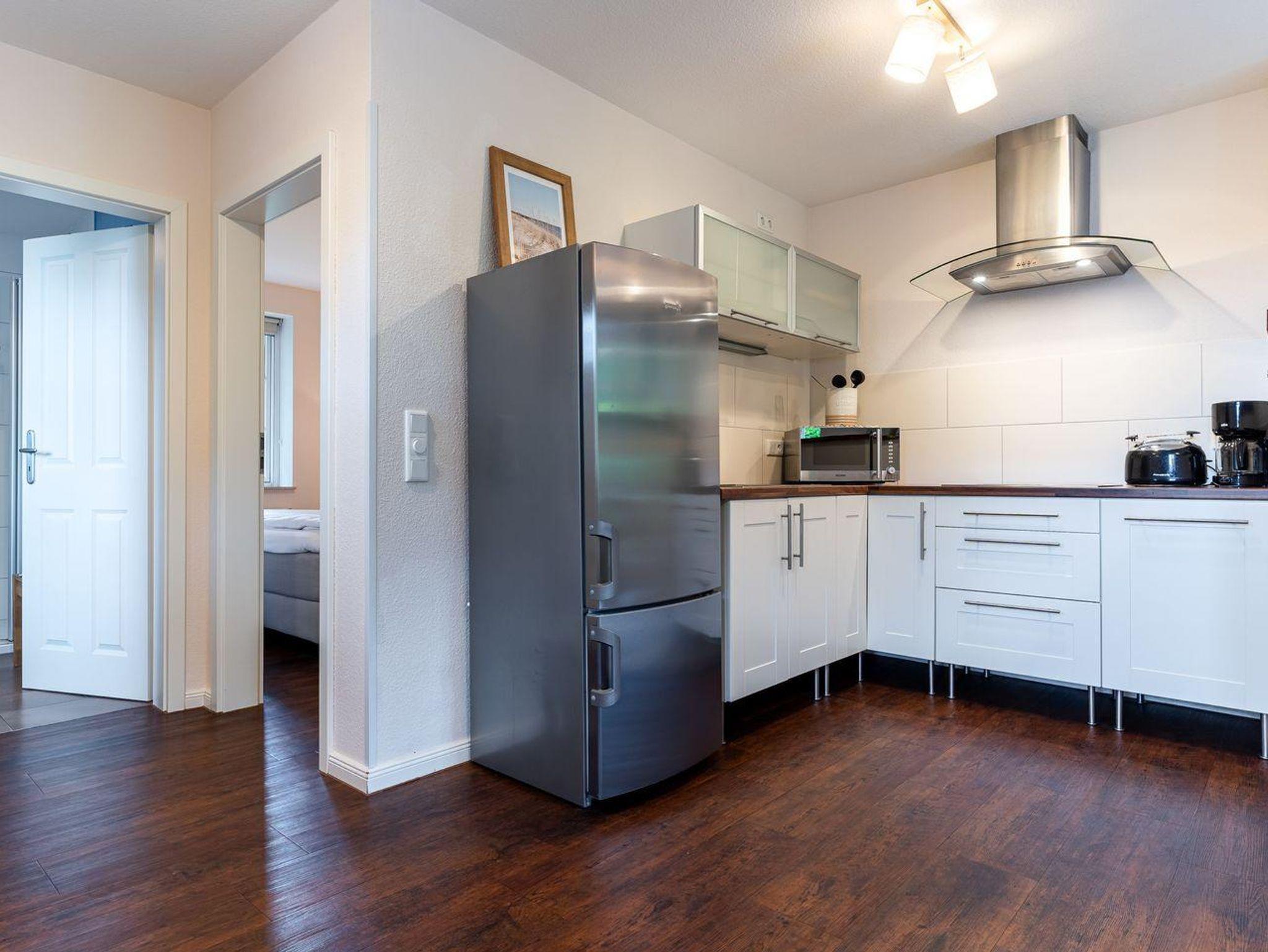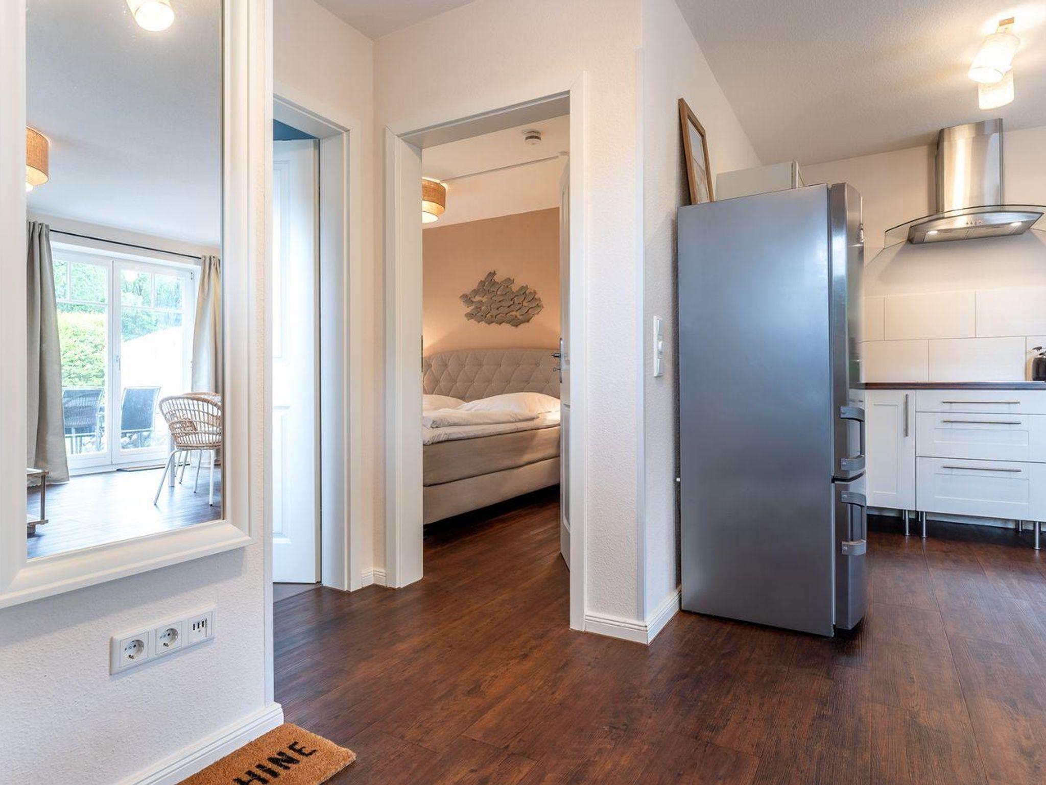 Durch den separaten Eingang betreten Sie den hellen und einladenden Wohnraum mit offener gut ausgestatteter Küche, Essecke und dem Wohnzimmer.