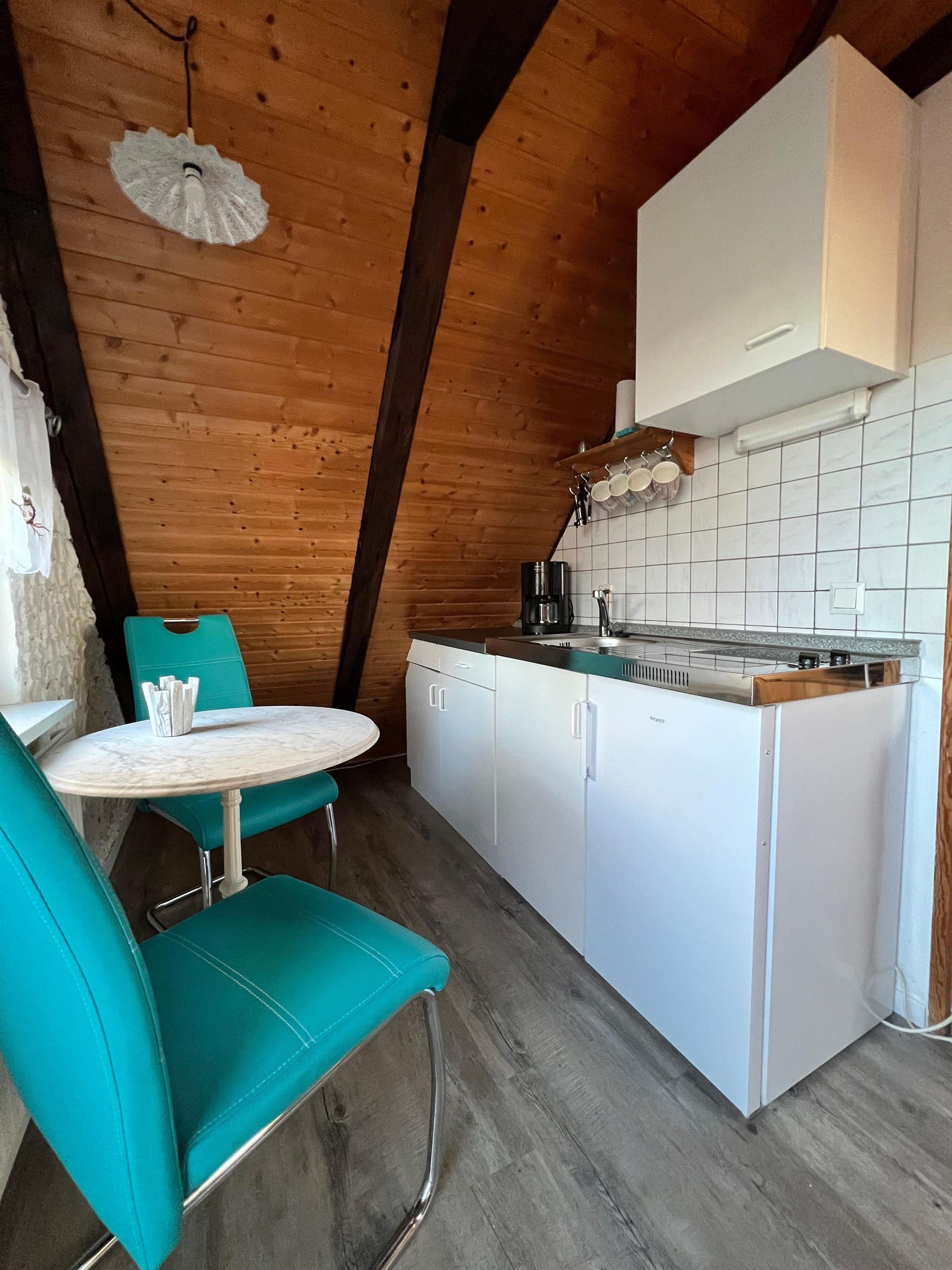 Integrierte Appartementküche mit Ceranfeld, Kühlschrank und selbstverständlich Kaffeemaschine, Toaster und Wasserkocher.