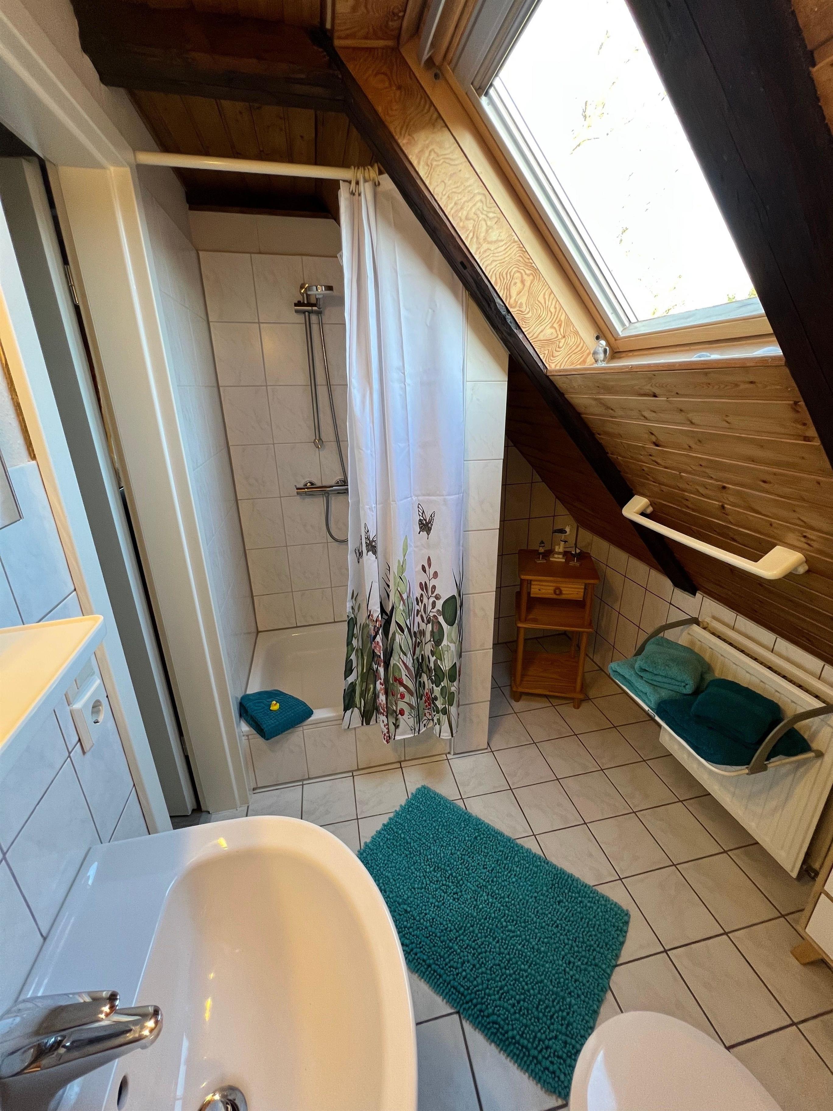 Dusche/WC mit Fenster, Föhn vorhanden.