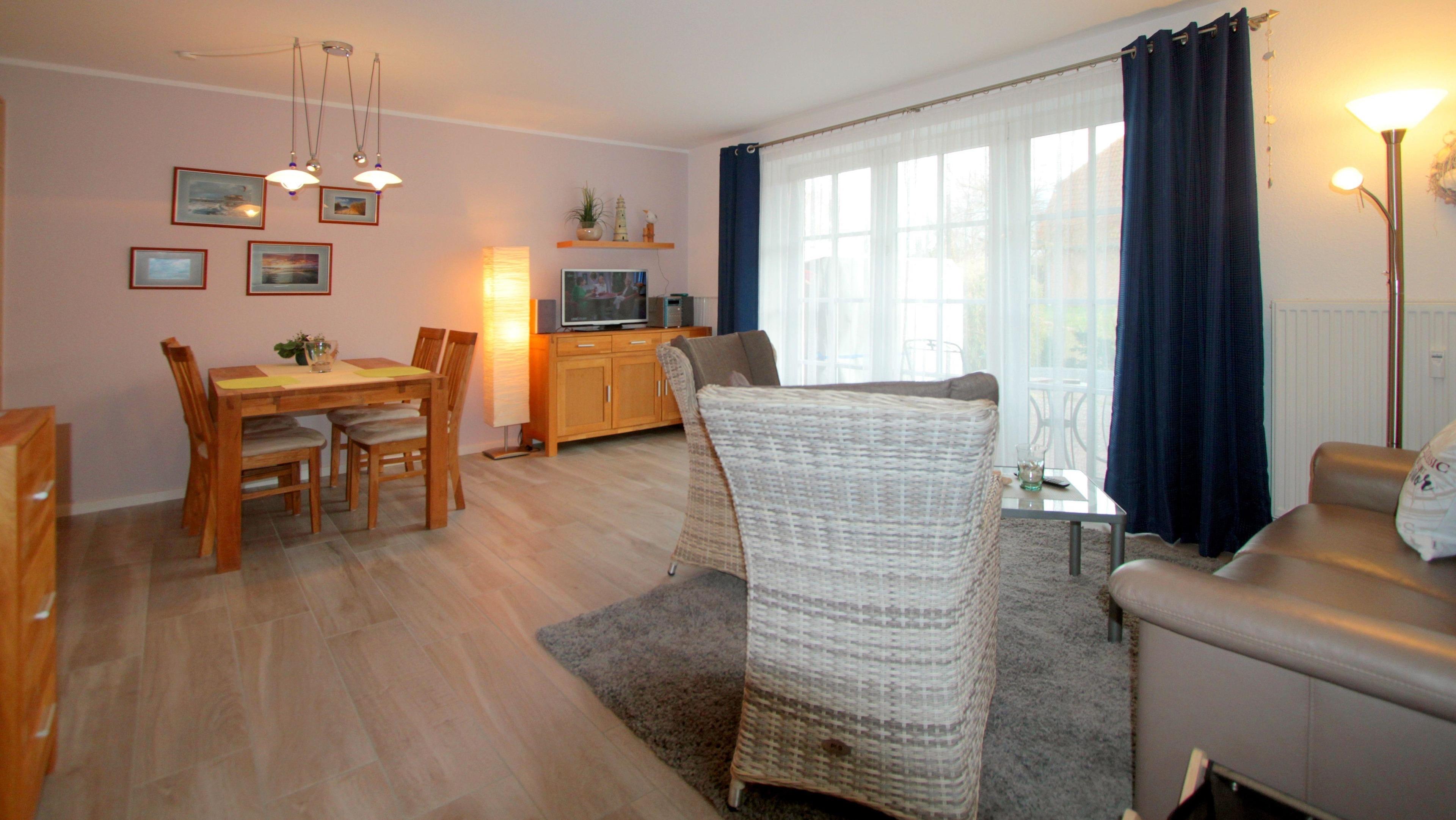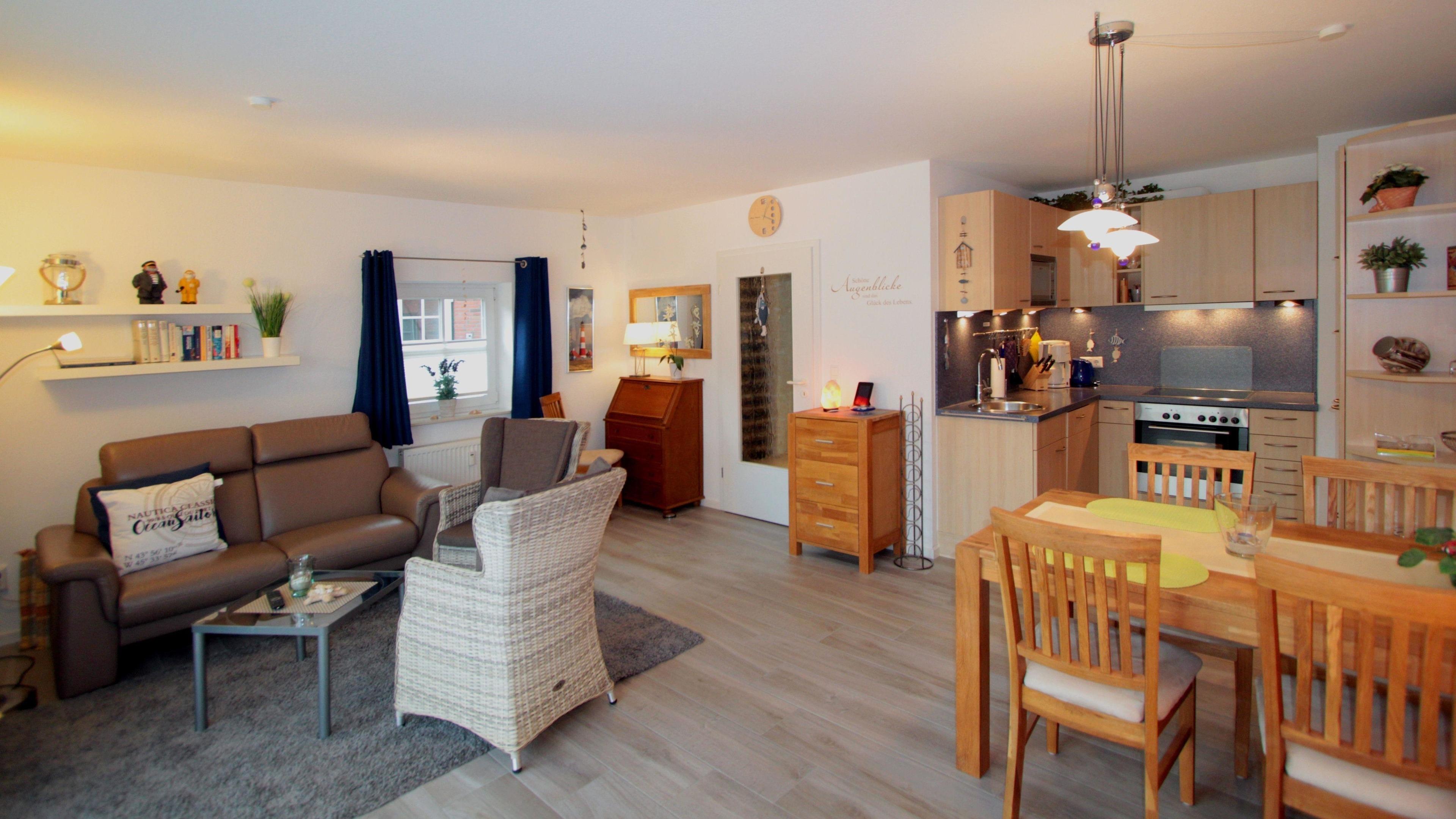Im Wohnzimmer mit integrierter Küche können Sie sich beim fernsehen oder bei genussvollen Mahlzeiten entspannen. Zwei Sessel, eine Couch und Couchtisch und ein Esstisch mit 4 Stühlen sind dort vorhanden. Der integrierte Küchenbereich lässt keinen Wunsch offen. Von Kaffeemaschine bis Geschirrspüler finden Sie dort viele Küchenhelfer.
