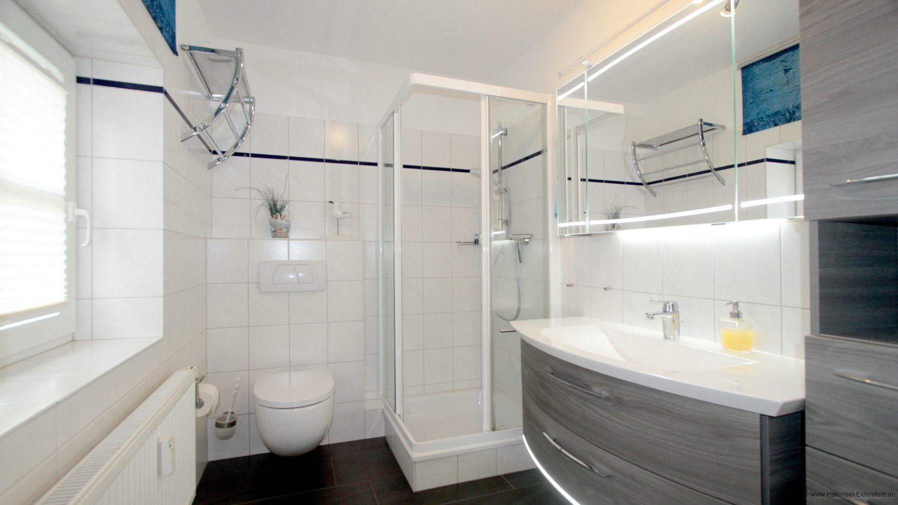 Das hübsche Badezimmer im modernen Stil lädt zum relaxten frisch machen ein. Ein großer Spiegel, viele Ablageflächen und eine Duschkabine aus Glas stehen Ihnen zur Verfügung.