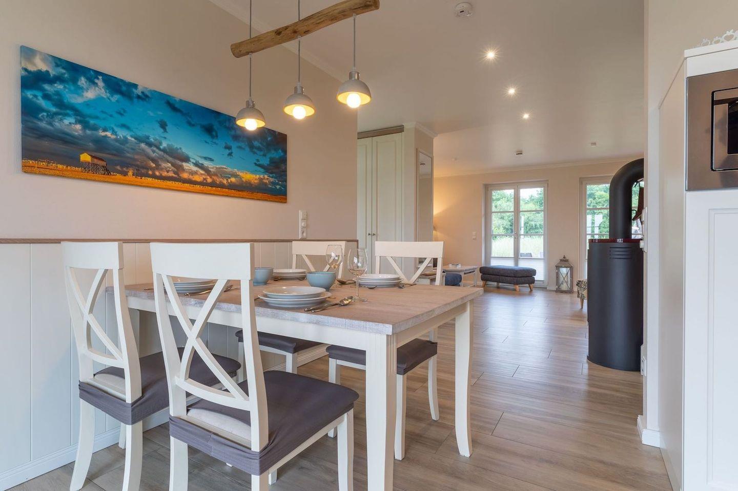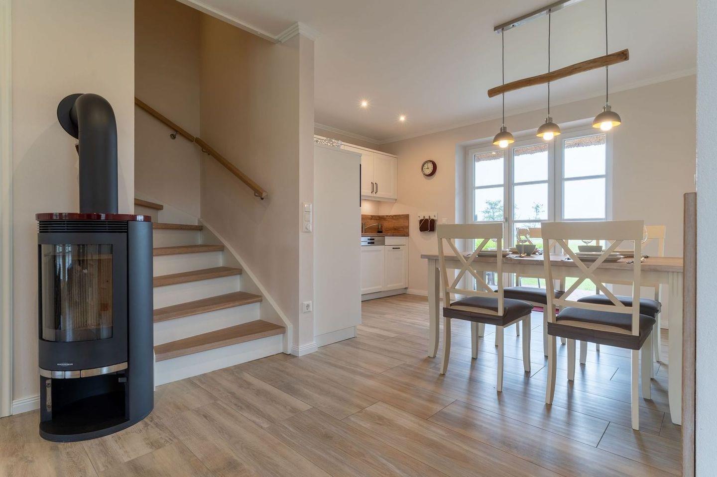 Im Erdgeschoss befindet sich der lichtdurchflutete Wohnraum mit TV, Kamin, einer offenen Küche sowie einem stilvollen Essbereich.
