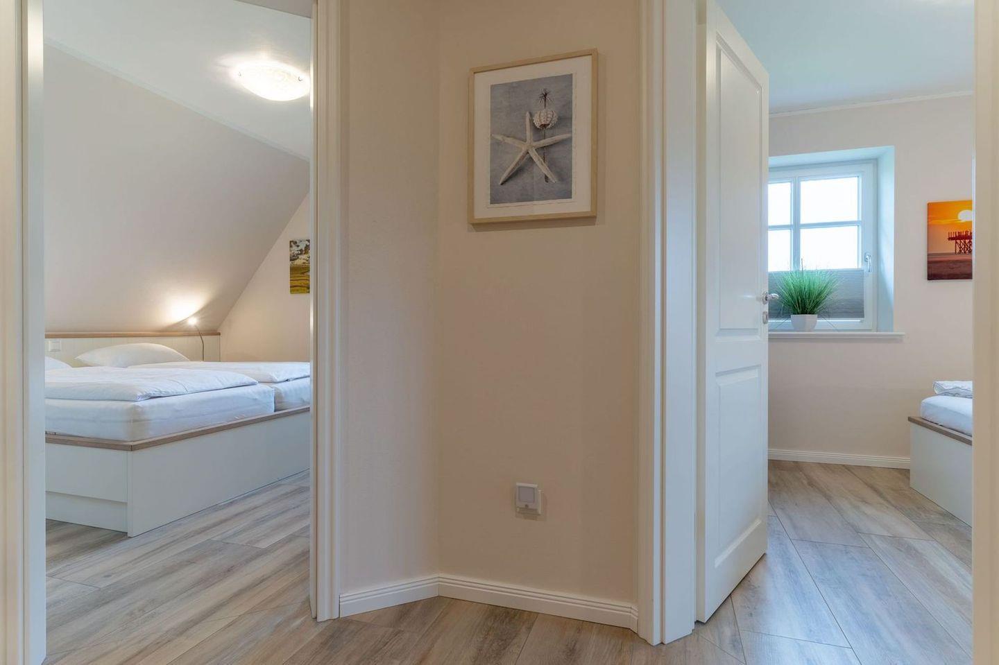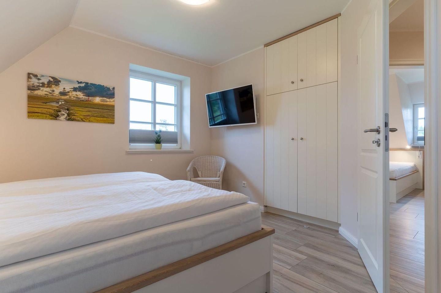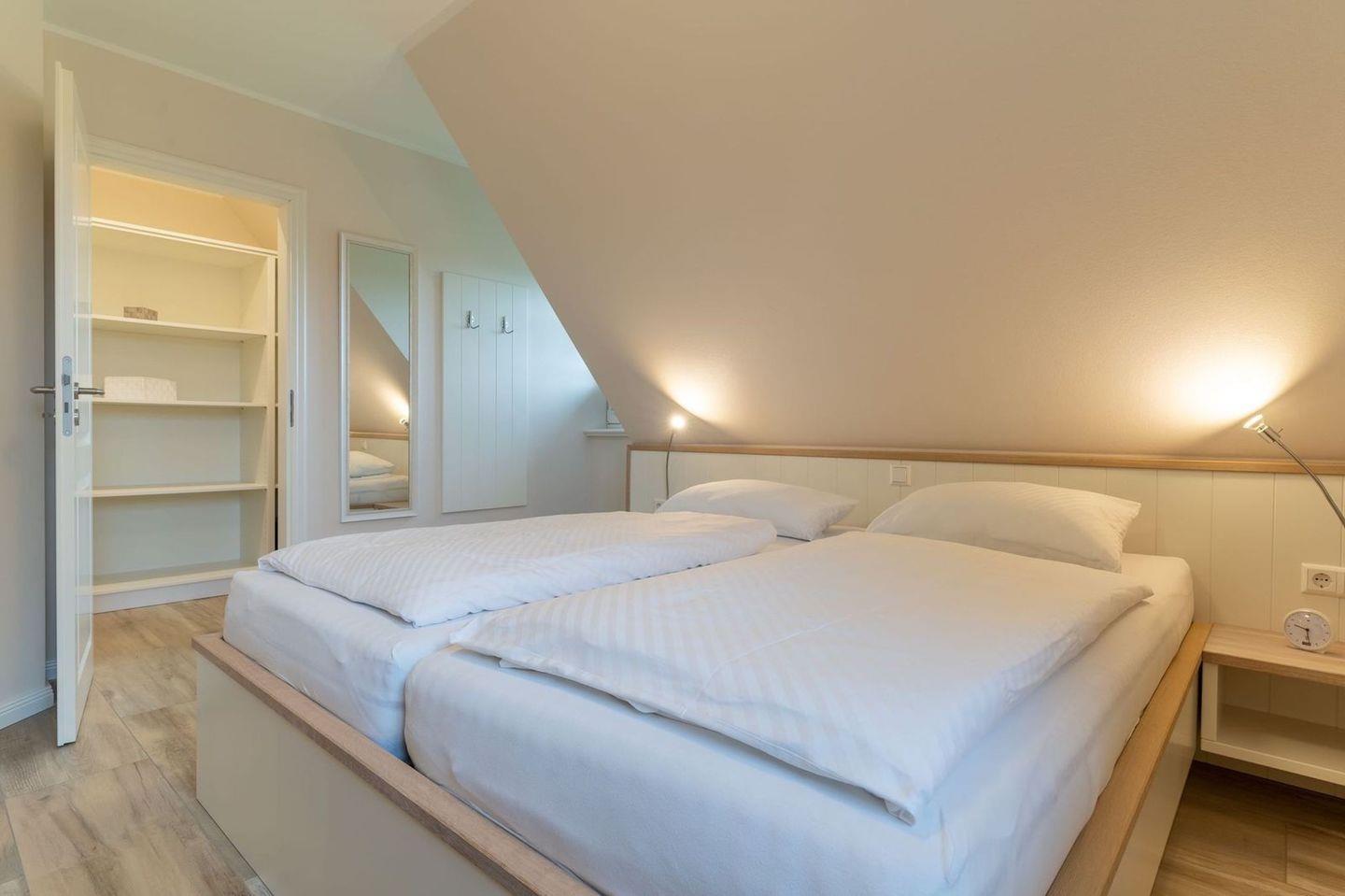 Über eine Holztreppe gelangt man in das Obergeschoss. Die beiden Schlafzimmer, jeweils mit einem Doppelbett sorgen für ruhevolle Erholung. Einbauschränke gewähren Ihnen hinreichend Ablageflächen.