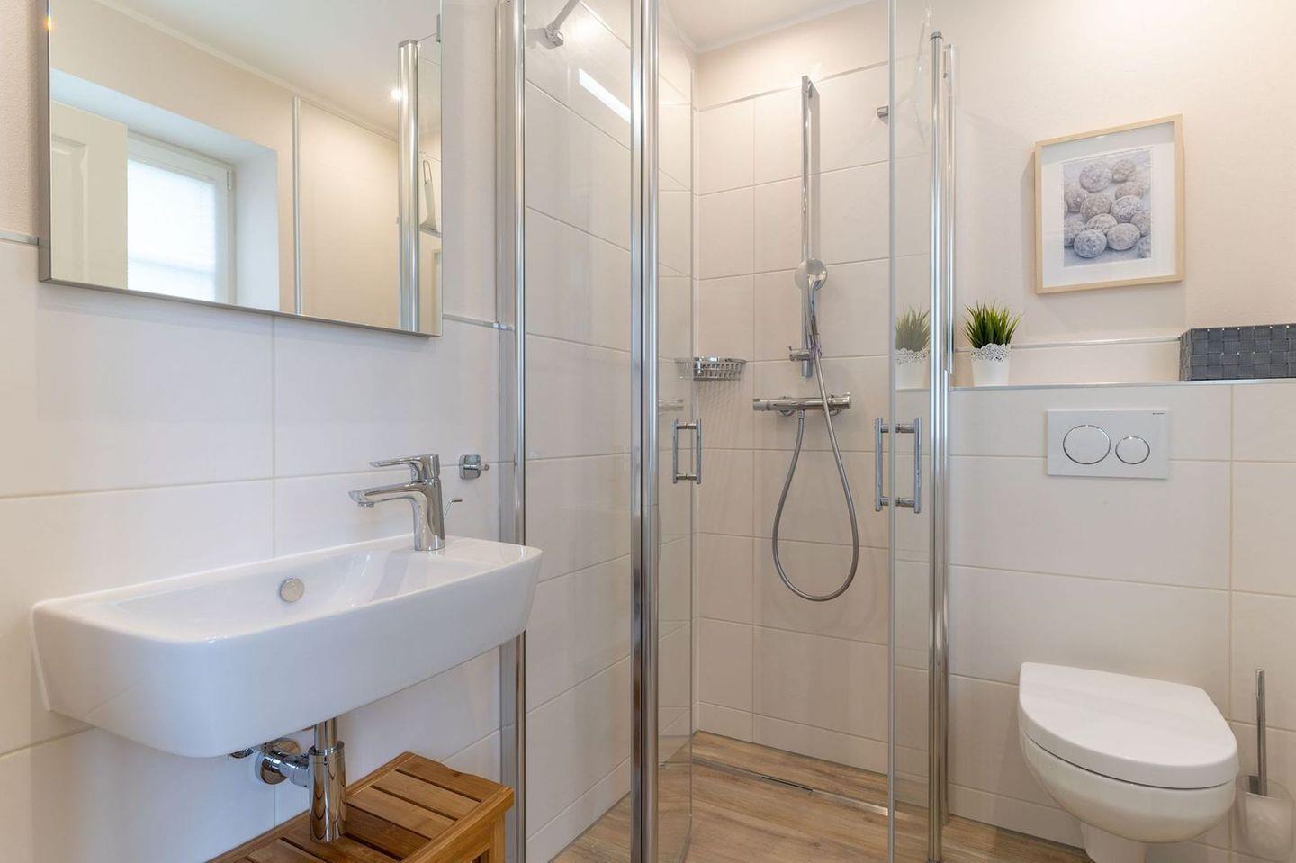 Darüber hinaus befindet sich im Obergeschoss ein weiteres, geräumiges Bad mit Dusche und Badewanne.