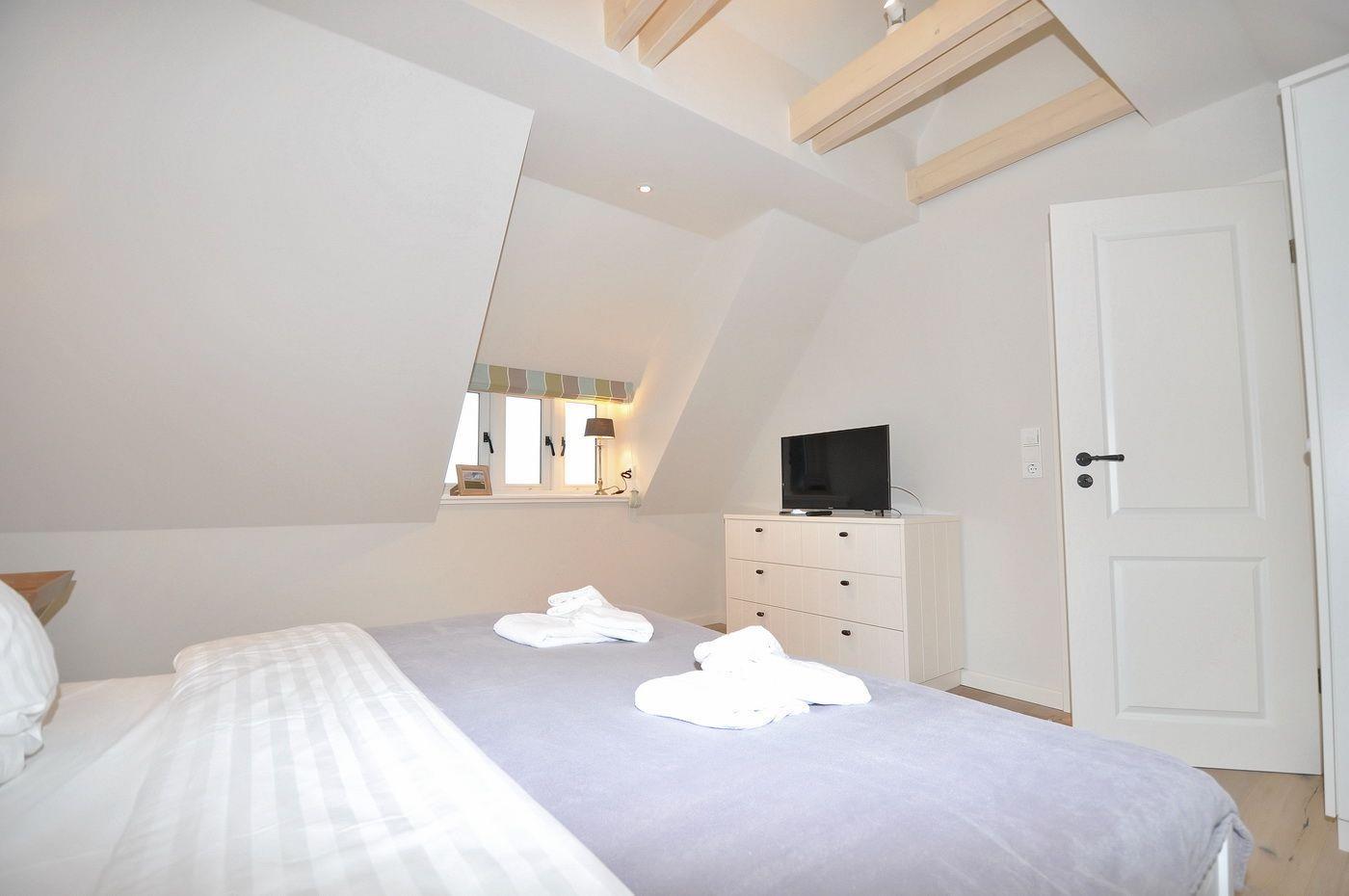 Obergeschoss: eine Galerie, 2 Schlafzimmer mit Doppelbett (jeweils 180 x 200 cm - Einzelmatratzen) und TV, ein Wannenbad mit separater Dusche