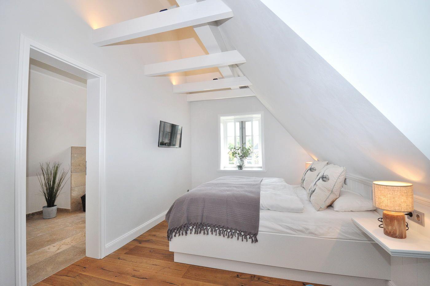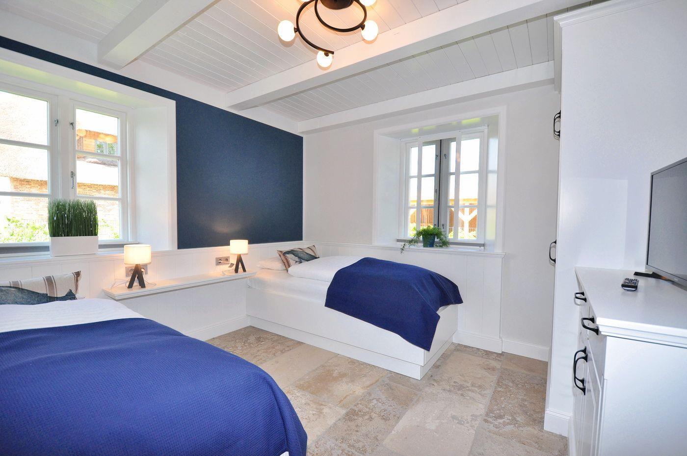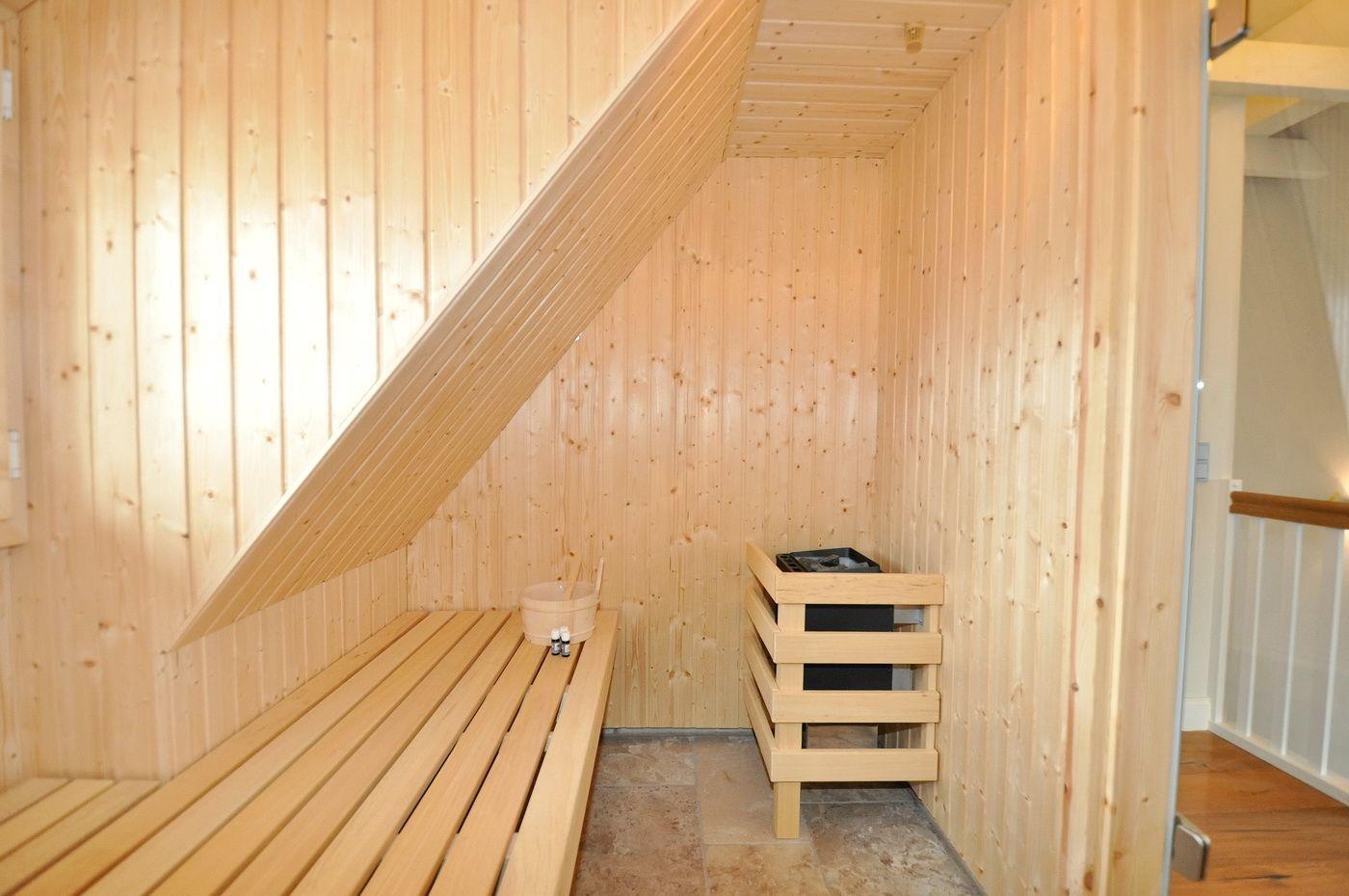 Obergeschoss: zwei Schlafzimmer mit Doppelbett (je 180 x 200 cm), TV und jeweils einem Duschbad en Suite, eine Sauna