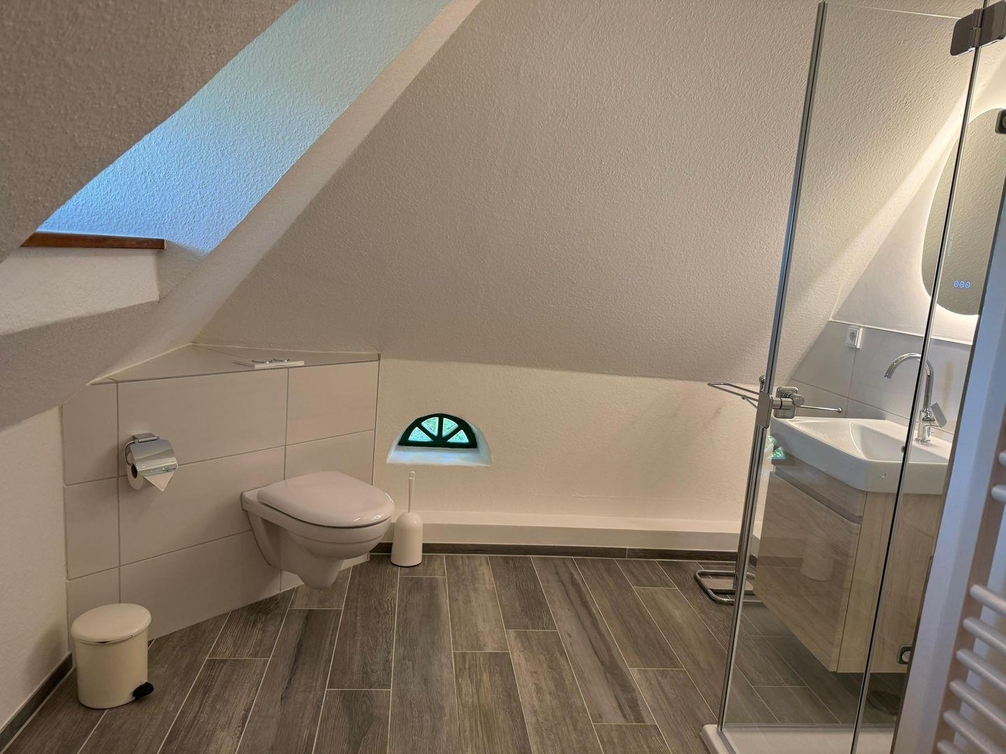 OG - Große Empore als Wohn-/Schlafbereich mit 2 Betten (Schlafsofa), Duschbad/WC, Abstellraum. Großer Naturgarten mit Sitzecke und Schilfteich, zwei PKW-Stellplätze. Haustiere nicht erlaubt.
