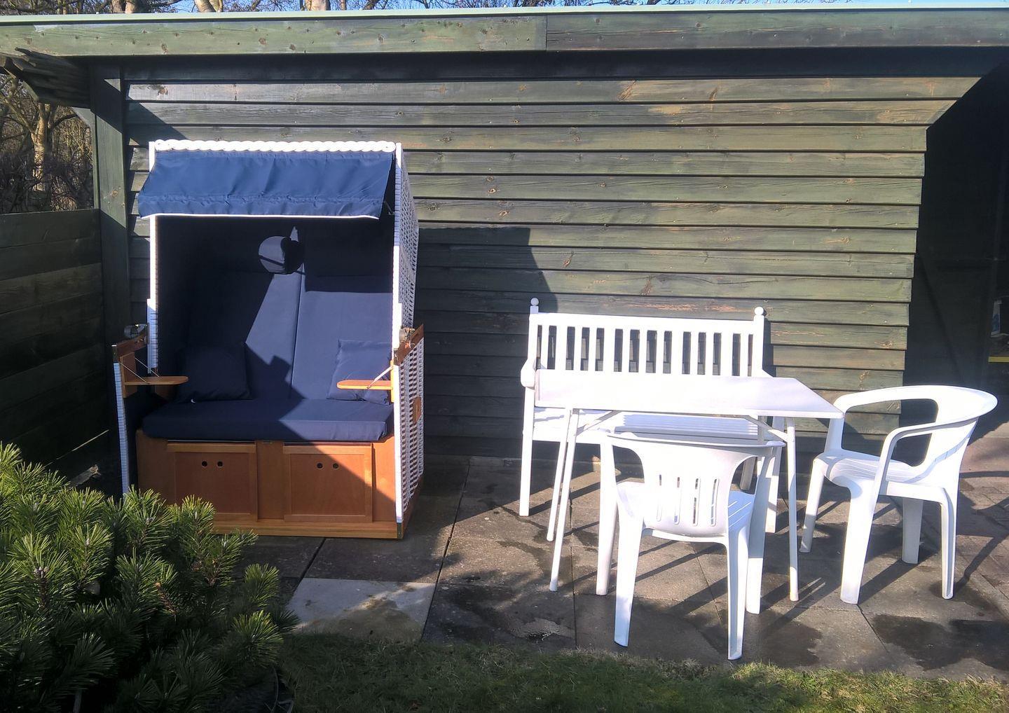 Die von der Straße nicht einsehbare Terrasse mit Gartenmöbeln kann teilweise mit einer Außenmarkise abgeschattet werden. Ein gemeinsam nutzbarer Strandkorb im Garten lädt zum relaxen ein.