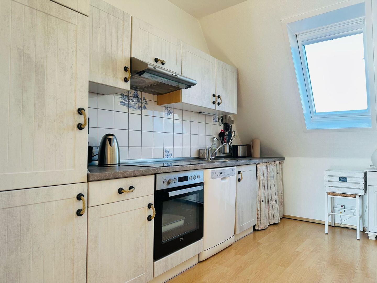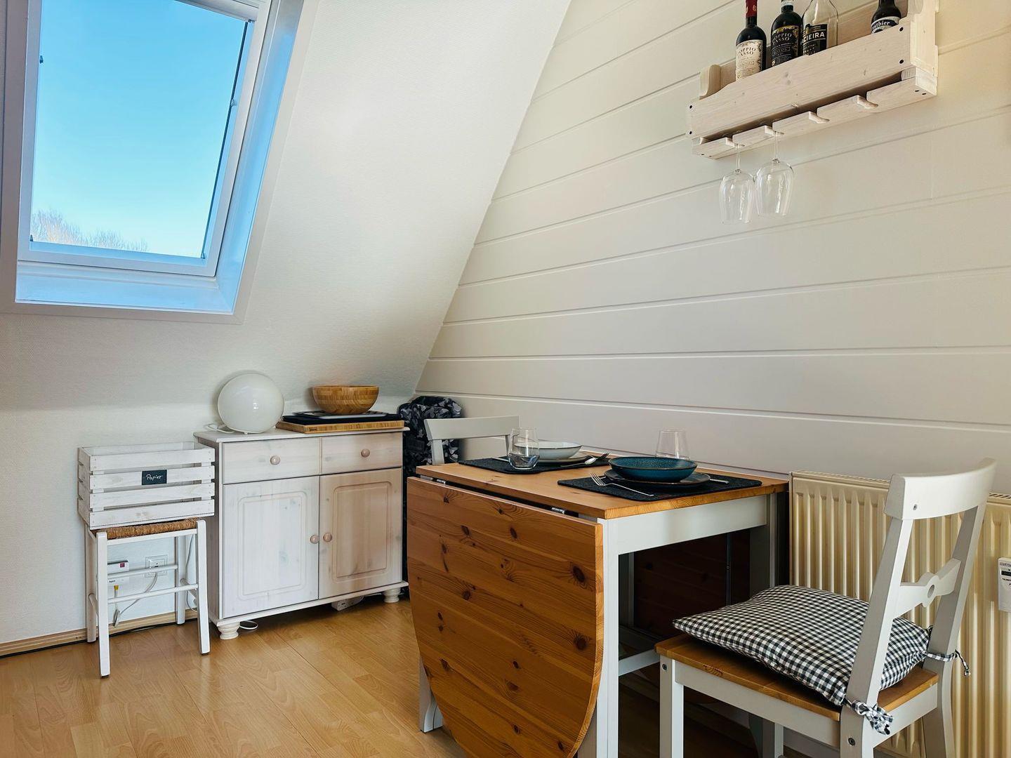 Sie erstreckt sich über 2 Etagen, darunter 2 Schlafzimmer, wovon sich eines im Spitzboden befindet. Ein Schlafzimmer kann auf Wunsch auch als Arbeitszimmer genutzt werden, um den Aufenthalt noch flexibler zu gestalten. Des Weiteren gibt es 1 Badezimmer.