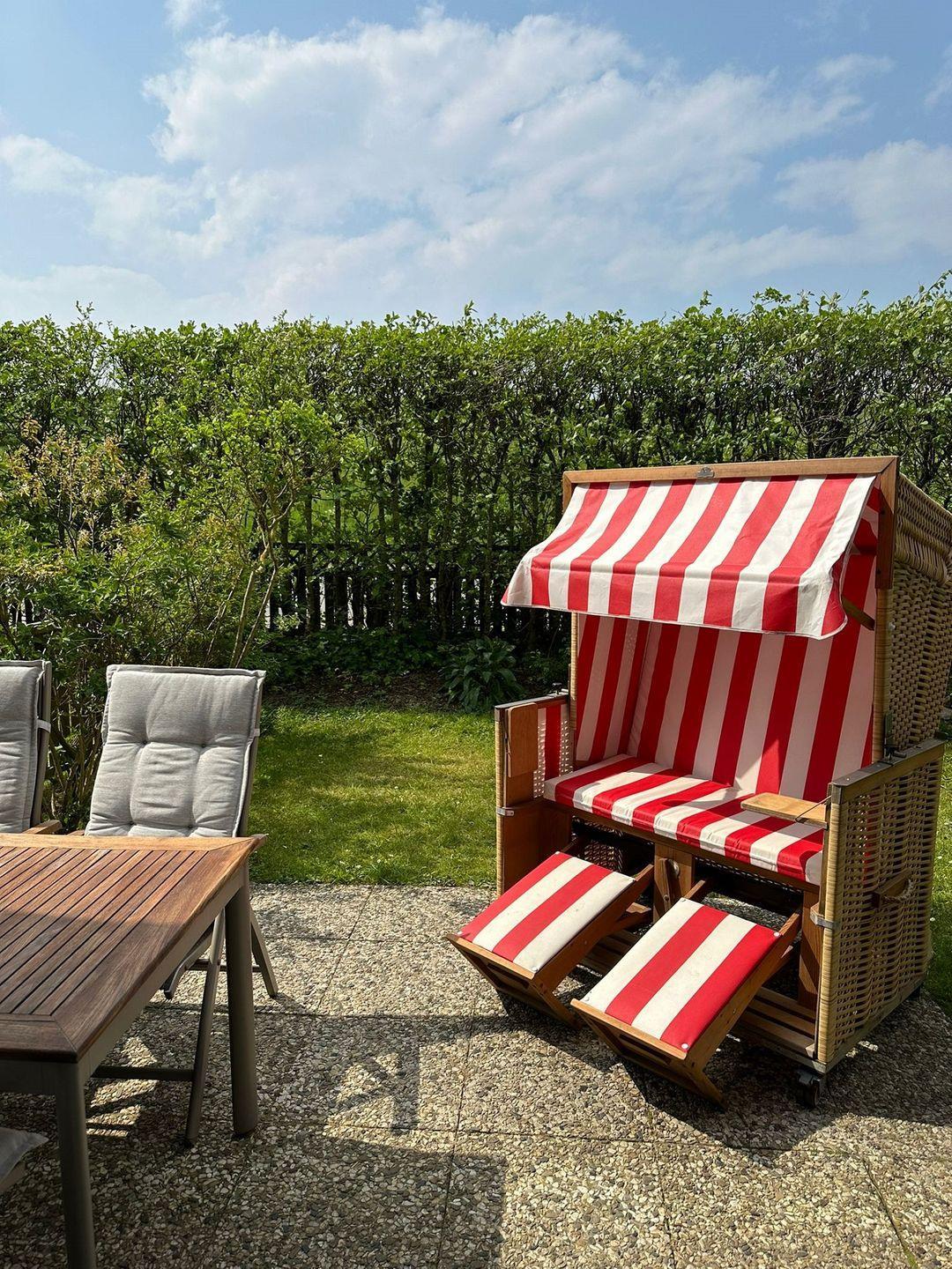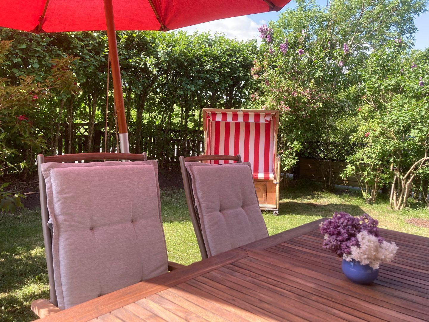 Die Terrasse ist mit einem Tisch, 4 Stühlen, einem Sonnenschirm und einem Strandkorb ausgestattet.
