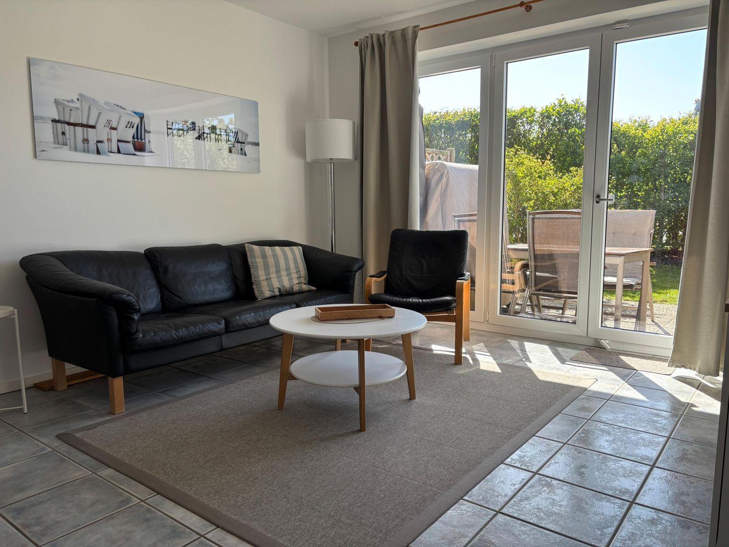 Das Wohnzimmer, die Terrasse und der eingezäunte Garten mit Strandkorb sind nach Westen ausgerichtet und bieten die perfekte Möglichkeit für einen gemütlichen Tagesausklang.