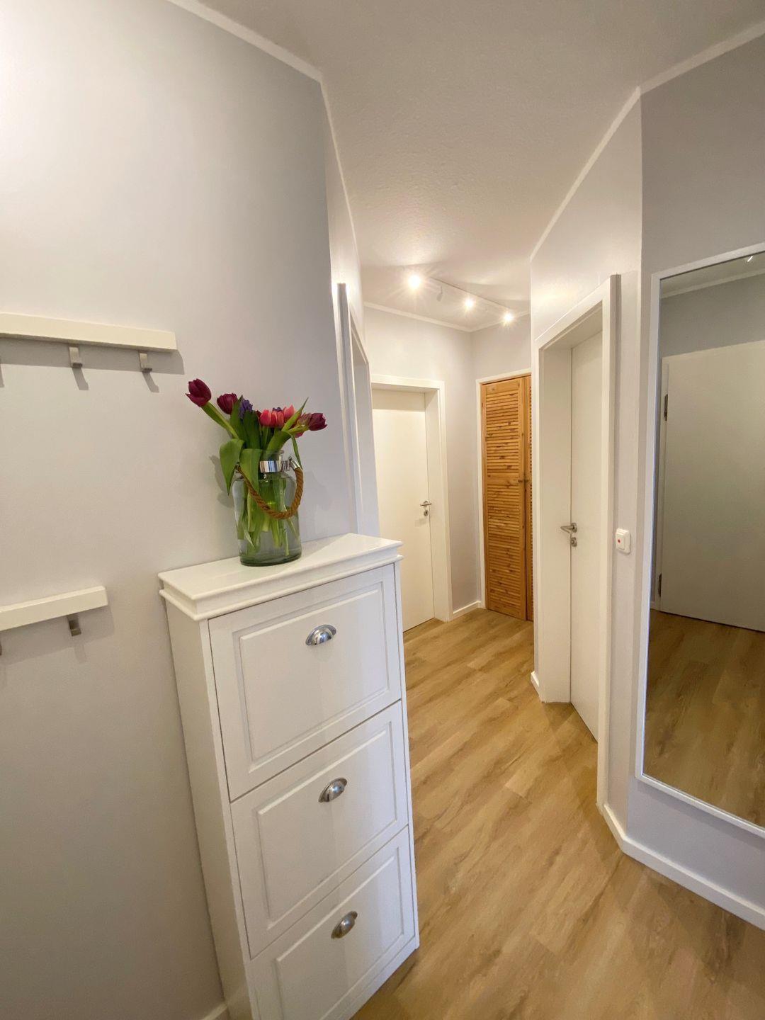 Die geschmackvolle Wohnung ist für 4 Personen ausgelegt und hat einen großzügigen Wohnraum mit einer Sitzecke, einem Flachbildfernseher, DVD Player, DVDs und einem Esstisch. Vom Wohnzimmer gelangen Sie auf den möblierten Balkon mit Blick auf den Deich. In der separaten Küche befindet sich ein Esstisch, eine Spülmaschine, Mikrowelle und ein Kühlschrank mit Gefrierfach. Die Wohnung verfügt über 2 Schlafräume. Das erste hat ein Doppelbett, einen großen Kleiderschrank und einen Fernseher. Das zweite Zimmer hat zwei Einzelbetten und ebenfalls einen großen Kleiderschrank. Das Duschbad bietet ausreichend Platz für Ihre Utensilien. Kinderbett und Hochstuhl sind in der Wohnung vorhanden. Im Keller befinden sich Waschmaschine und Trockner zur gemeinschaftlichen Nutzung. Außerdem gehört zur Wohnung ein Tiefgaragenstellplatz. Rauchen und Haustiere sind in der Wohnung nicht erlaubt.