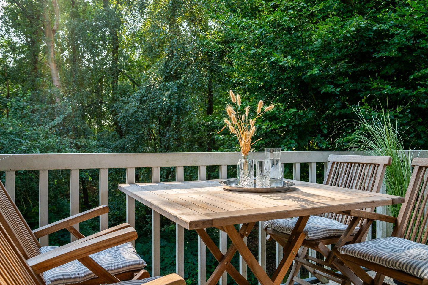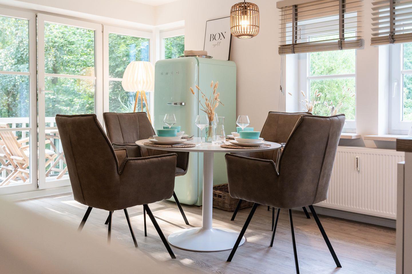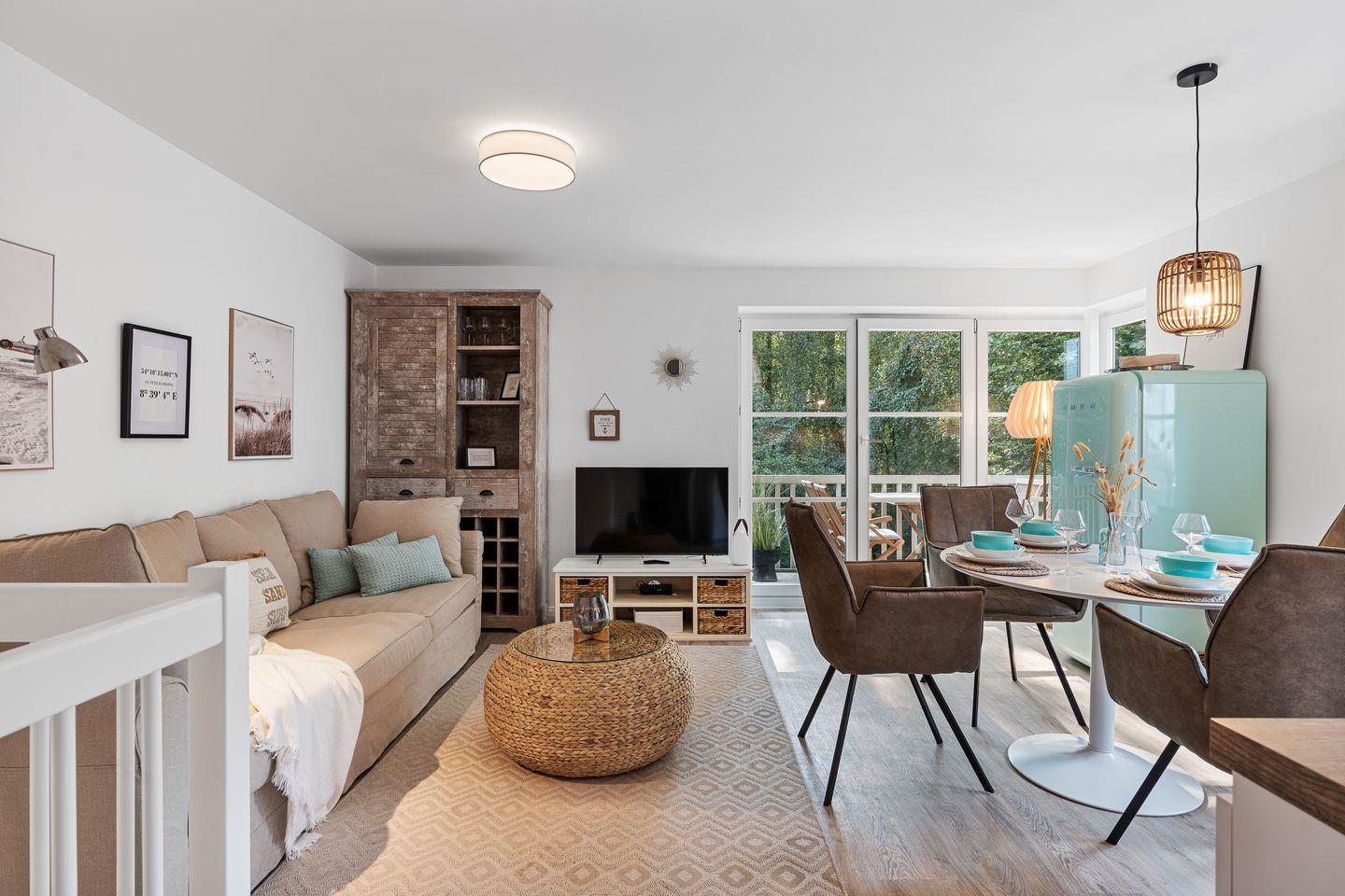 Das Wohnzimmer lädt mit einem stilvollen Sofa, einem großartigen Smart-TV und einem Esstisch mit 4 Stühlen zum Verweilen ein. Es bietet zudem direkten Zugang zum möblierten Balkon in südlicher Ausrichtung. Die offene Küche ist voll ausgestattet mit einem Induktionsfeld, einem Backofen, Mikrowelle, einer Kühl-Gefrier-Kombination und einem Geschirrspüler.