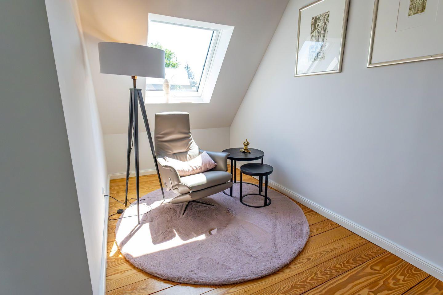 Das Lesezimmer wurde im Rahmen der Renovierung mit einem Dachflächenfenster versehen und hält einen hochwertigen Relaxsessel bereit.