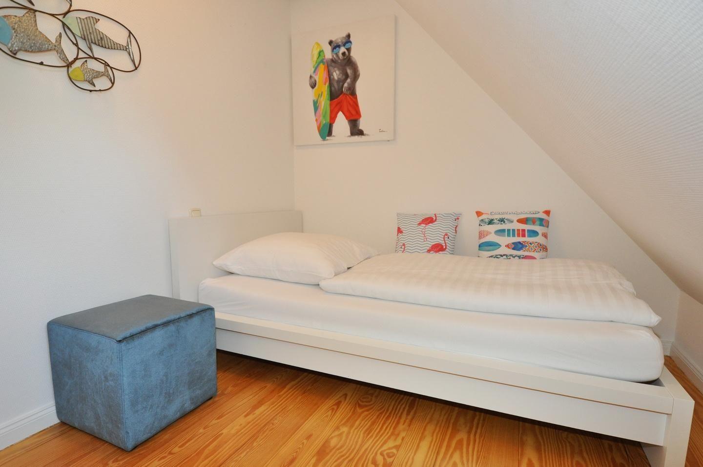 Obergeschoss: ein Schlafzimmer mit Doppelbett (180 x 200 cm - durchgehender Topper), ein Schlafzimmer mit Einzelbett (110 x 190 cm), ein Lesezimmer, ein Duschbad / WC