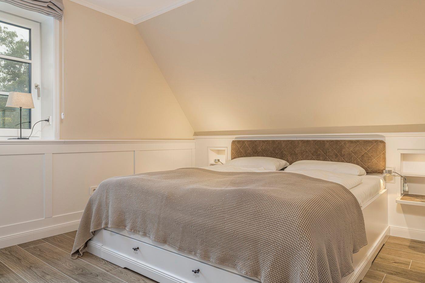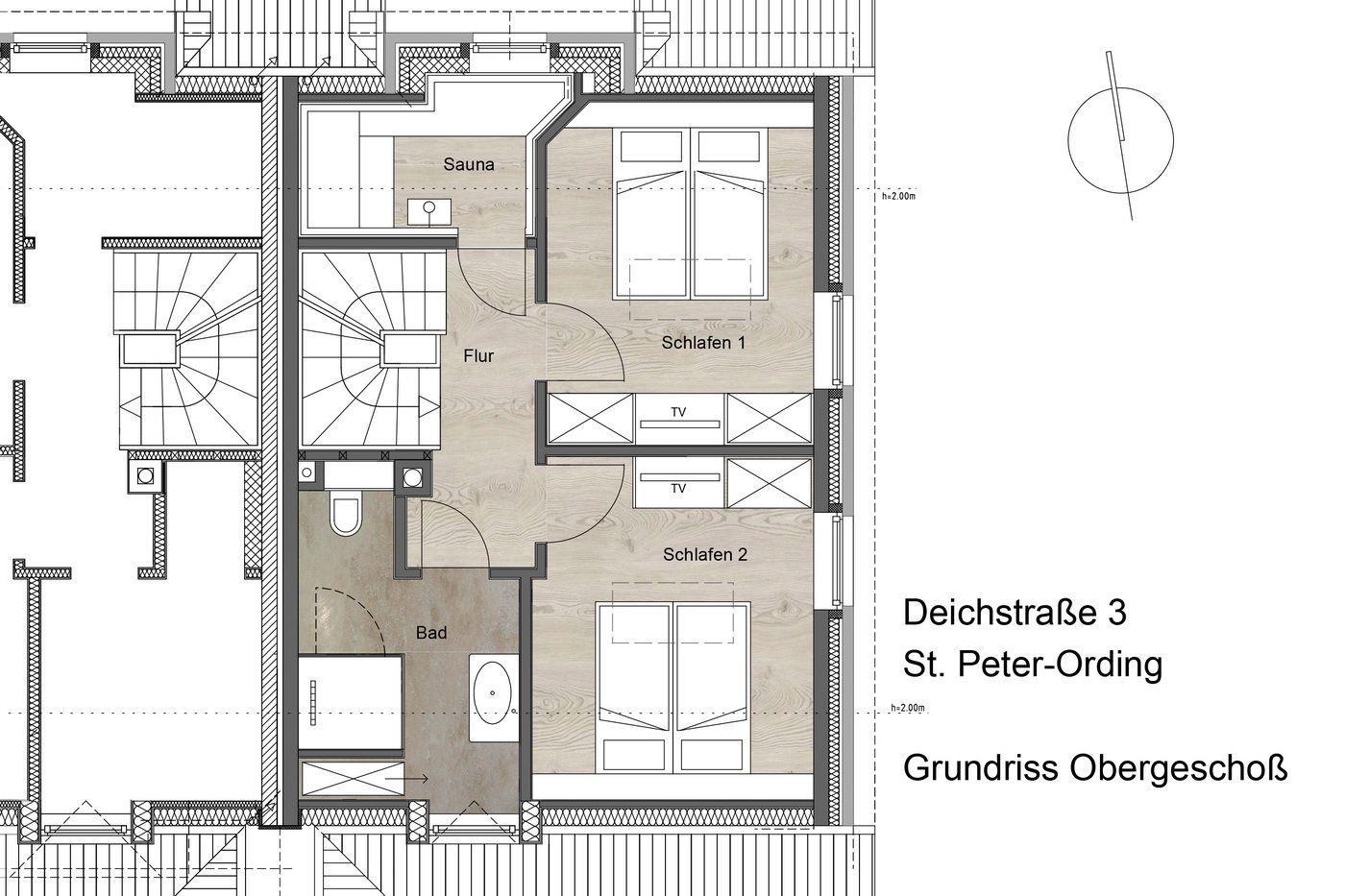 Obergeschoss: 2 Schlafzimmer mit Doppelbett (jeweils 180 x 200 cm - Einzelmatratzen) und TV, ein Duschbad/ WC, eine separate Sauna