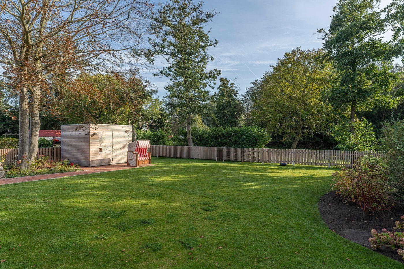 Auf der Terrasse befinden sich während der Saison Gartenmöbel und ein Strandkorb.
