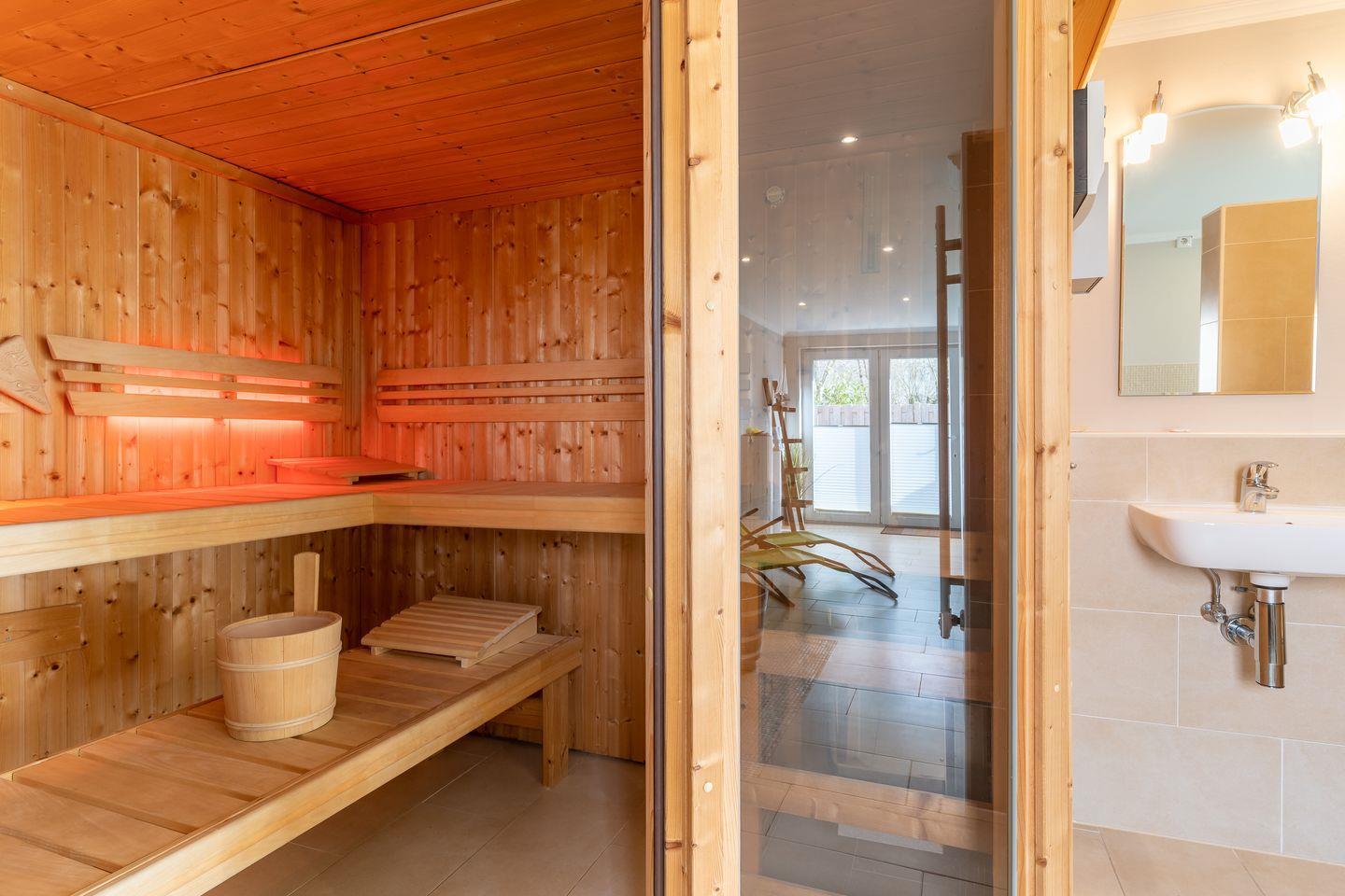 In einem separaten wunderschönen Anbau lädt der große Wellnessraum mit Sauna, Ruhezone, Dusche, WC und eingezäunter Terrasse zur Erholung ein. Traumhaft schön und einzigartig in SPO! (Nutzbar von 2 Appartements im Haus gegen Gebühr) Carpe Diem!