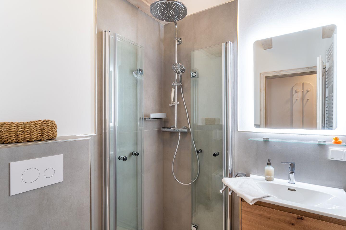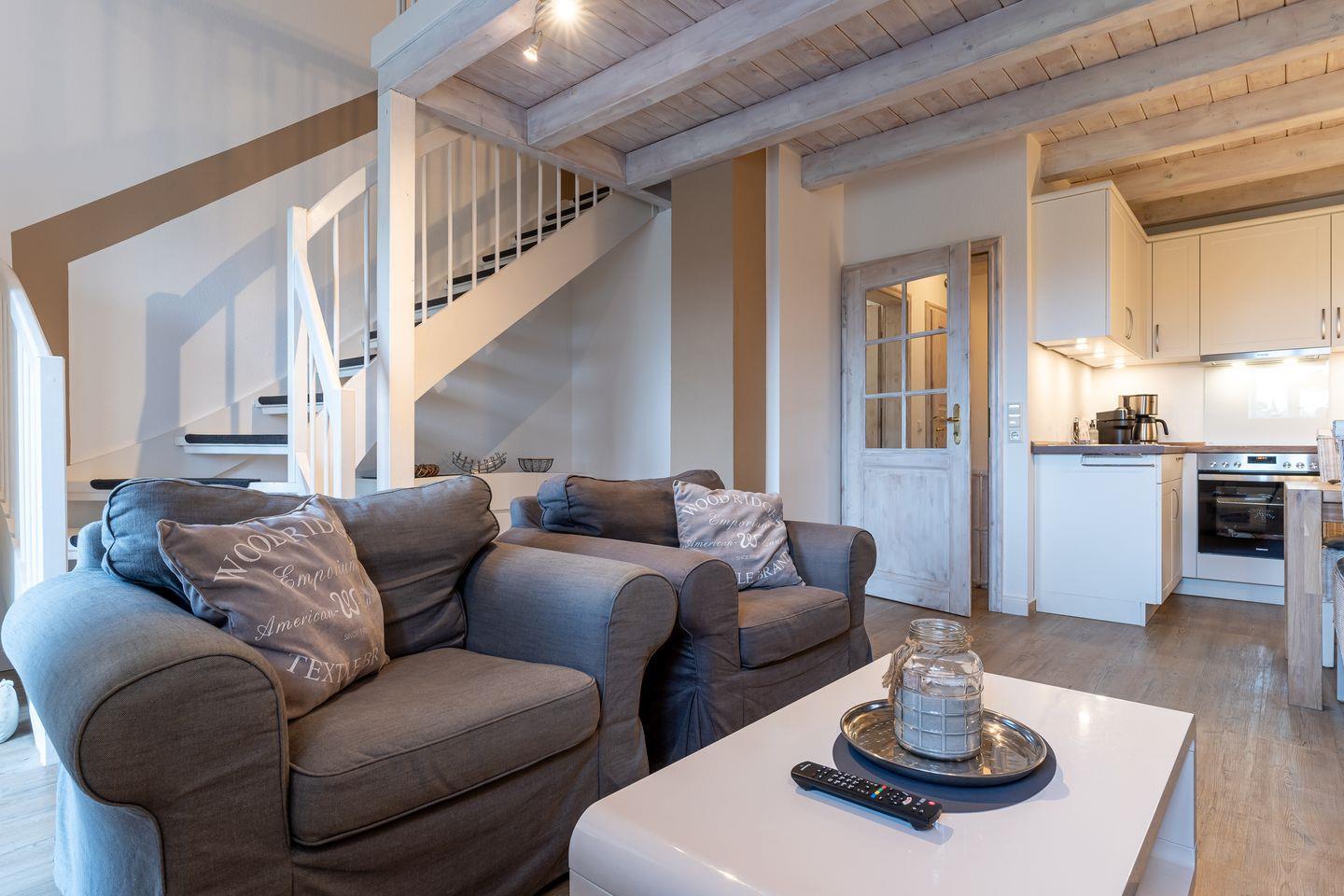 Das Appartement befindet sich im Erdgeschoss und erstreckt sich über 2 Etagen. Es verfügt über ca. 60 m² Wohnfläche und teilt sich wie folgt auf: Auf der ersten Etage befindet sich ein großzügiger Wohnraum mit einer offenen Küche und einem gemütlichen Essbereich. Die Küche ist voll ausgestattet. Ein separates Duschbad bietet jeden Komfort. Über eine Holztreppe gelangt man zur Schlafgalerie im Dachgeschoss. Das stilvolle Schlafzimmer verfügt über ein 1,8 x 2,0 m Boxspringbett mit 25 cm Steg. Weitere 2 Personen können auf der Schlafcouch im Wohnzimmer 1,6 x 2,0 m entspannen. Kostenlose W-LAN Nutzung.