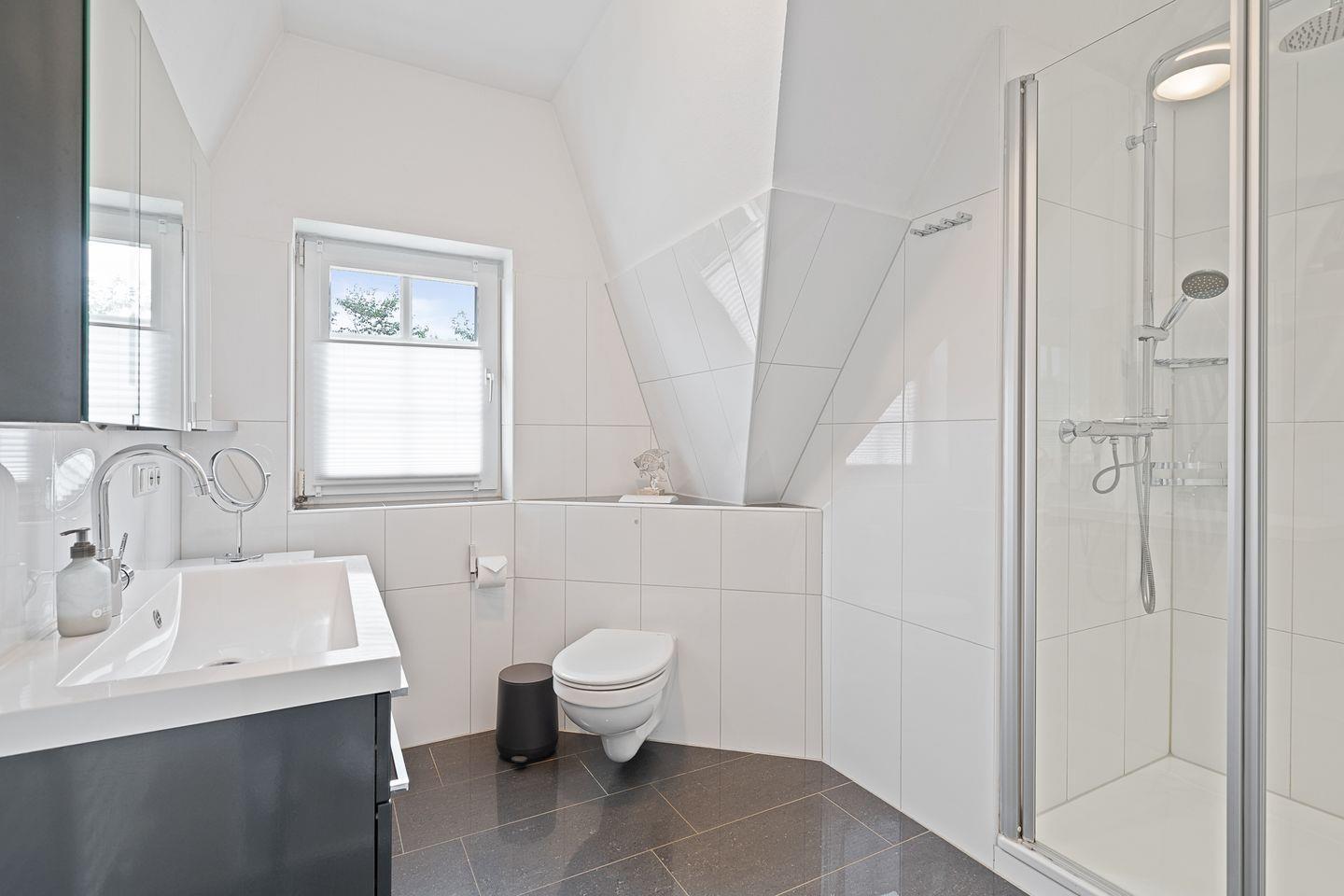 Über eine Rundtreppe gelangt man in das Obergeschoss mit zwei großzügigen Schlafzimmern und einem Duschbad.