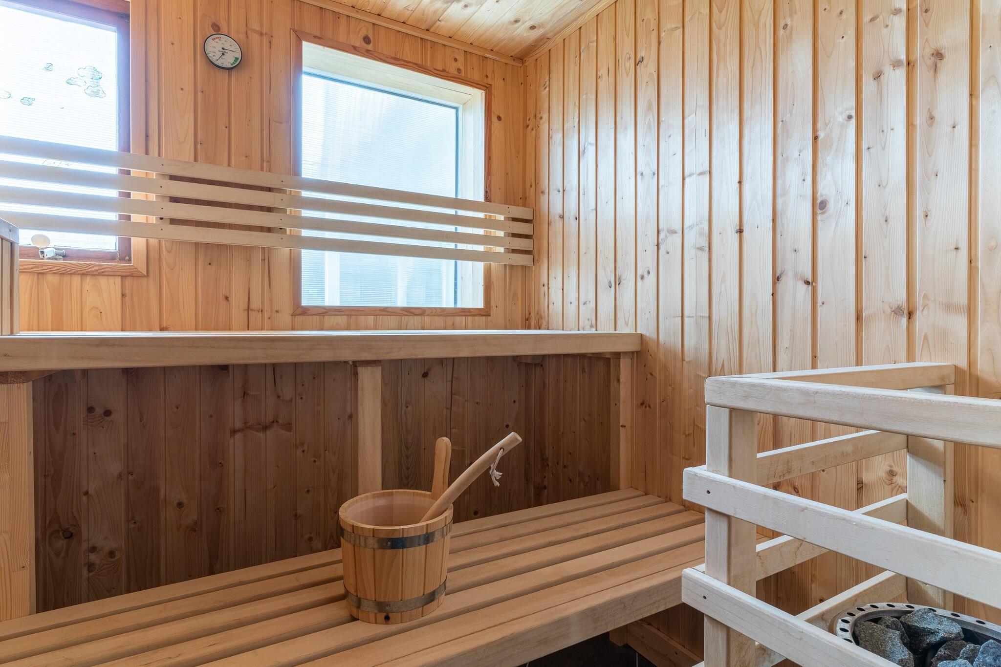 På 1. etage: (åbent køkken(kogeplade(Komfur med fire kogeplader, glaskeramisk), elkedel, brødrister, emhætte, kaffemaskine, ovn, mikrobølgeovn, opvaskemaskine , køleskab(+ fryser)), stue / spisestue(Fjernsyn(fladskærm, parabol), spisebord(4 personer), radio, CD-afspiller), soveværelse(dobbeltseng(180 x 200 cm)), badeværelse(bruser, håndvask, toilet)) tørretumbler(deles med andre gæster, betalt), sauna(deles med andre gæster, betalt), vaskemaskine(deles med andre gæster, betalt), balkon, varme(olie), cykelopbevaring(deles med andre gæster), havemøbler, parkering, Vaskeripakke inkl.