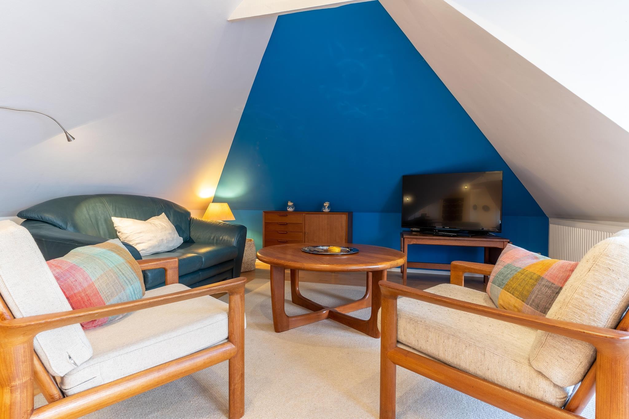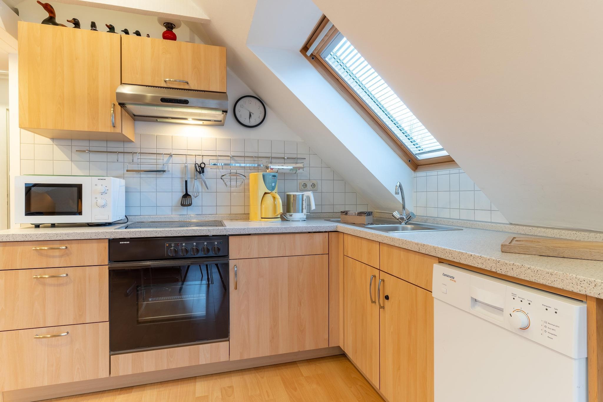 Den ca. 45 kvm store og lyse ferielejlighed til 2 personer ligger på øverste etage og loftet i et enkelt hus med i alt 3 lejligheder. Her er de bedste betingelser for at tilbringe en afslappende ferie. Der er en privat parkeringsplads og et aflåseligt cykelskur lige foran huset. . Balkonen har et areal på ca. 8 kvm.Stuen og spiseområdet med køkkenet har en tre-stribet tagvindue, hvorigennem der trænger meget lys ind. Highlights inkluderet: Wi-Fi, elektricitet, varme og vand, linnedpakke og slutrengøring er inkluderet i lejeprisen. Aktiviteter i nærheden: 12 km lang og 2 km bred fin sandstrand kombineret med duften af fyrretræer og saltmarsken: Det er Sankt Peter-Ording! Oplev Tysklands eneste badeby med sin egen svovlkilde. Det lange ferieområde består af fire distrikter, hvoraf det smukkeste er den gamle Sankt Peter-by. Her ligger den gamle murstenskirke ved siden af de mange frederikshavnske huse med stråtag. Hver del af landsbyen har sin egen badestrand med en restaurant på pæle. West Coast Park med sin kæledyrszoo og unikke sælarium byder på et varieret udvalg for hele familien. Der er også plads til de mindre gæster i legehuset 5 dage om ugen: legehuset er et børneparadis med hoppeborge, boldbassin og masser af legetøj. Der tilbydes fælles lege, håndarbejde og bageeftermiddage. Men klovne, børnesangskrivere, dukketeatre, historiefortællere og tryllekunstnere er også hyppige gæster, som giver masser af sjov. For at benytte vaskemaskinen og tørretumbleren, som deles med de to andre lejligheder, skal du bruge en euromøntmaskine. Det er ikke tilladt at medbringe kæledyr og ryge i lejligheden.