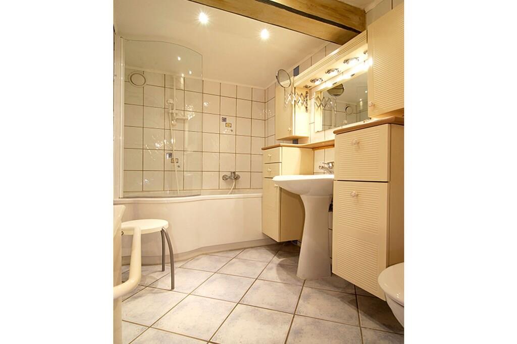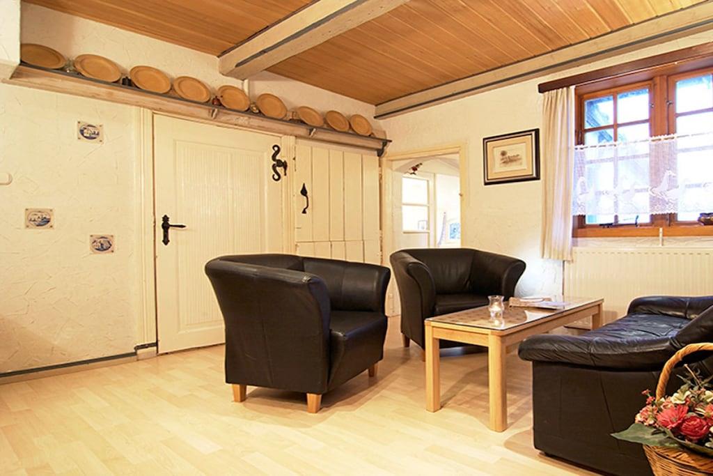 The "milking room" is located on the ground floor and has a quiet location facing east. Some of the supporting beams have been carefully exposed. Antique furniture and bright colors...