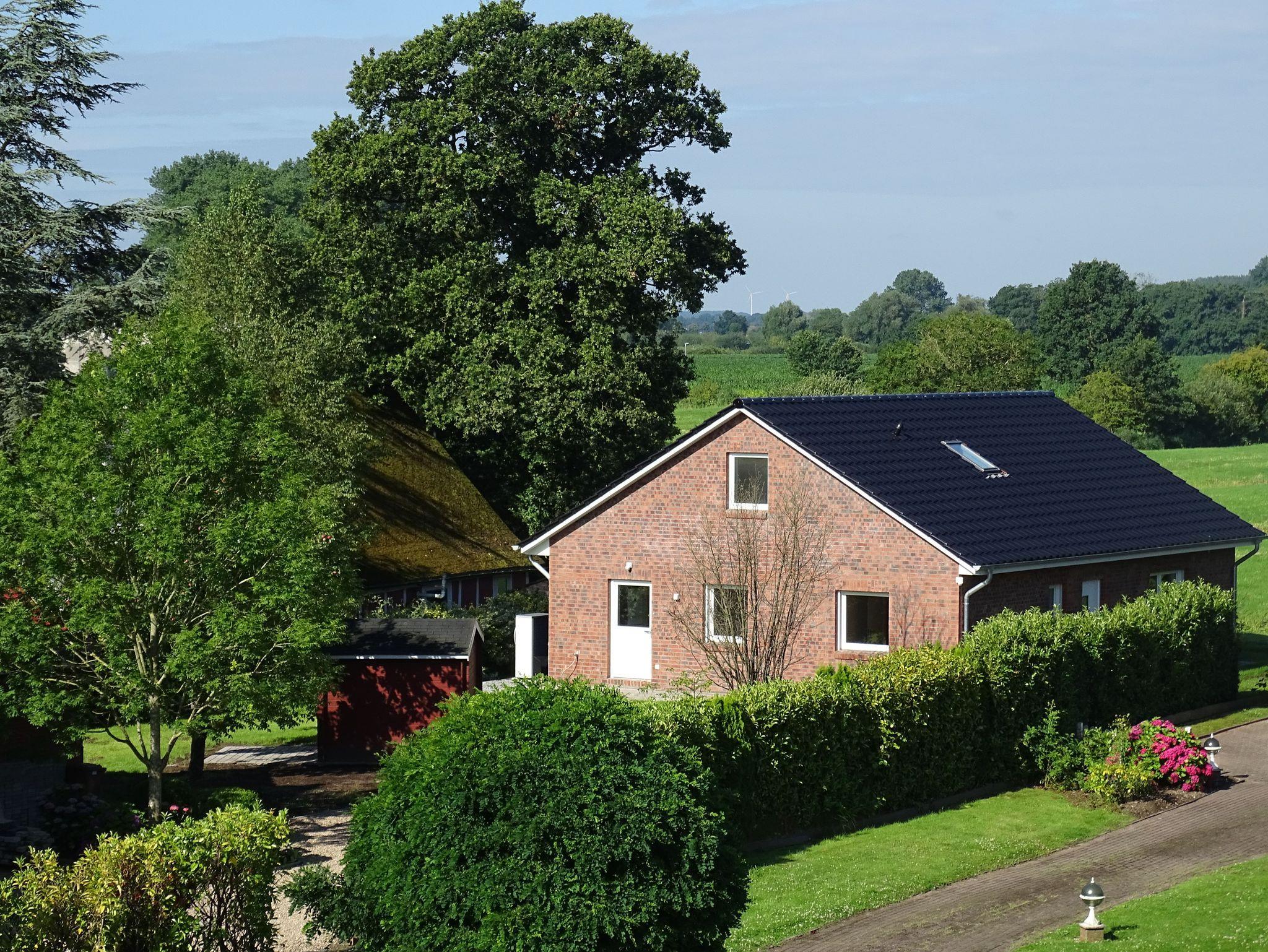 Unmittelbar am Abbenflether Elbdeich und Sandstrand, wo die dicken Pötte des Hamburger Hafens zum Greifen nah vorüberziehen, liegt unser nagelneues Ferienhaus Pagensand, als Ergänzung zu unserer bereits sehr beliebten Ferienwohnung. Genießen Sie die absolute Ruhe inmitten der herrlichen Natur des Kehdinger Landes auf einem eigenen Grundstück! Nur durch eine sehr ruhige Anwohnerstraße, die gleichzeitig Teil diverser Radwege ist, vom Deich getrennt, liegt vor dem Haus die Elbe mit ihrem feinen Sandstrand und den grasenden Schafen. Aus Küche und Wohnzimmer fällt der rückwärtige Blick über die Terrasse und den Garten in die Weite von Wiesen und Feldern, mit traumhaftem Wolkenspiel und romantischen Sonnenuntergängen am Himmel. Das gerade erst fertiggestellte Ferienhaus bietet Ihnen auf ca. 90 m² Wohnfläche mit zwei separaten Schlafzimmern Platz für 4 bis 5 Gäste, ein großzügiges Bad mit ebenerdiger Dusche sowie eine offene Küche mit angeschlossenem Wohn- und Essbereich. Ein hoher Sichtdachstuhl gibt diesem großen Raum eine besonders wohnliche Atmosphäre. Die gesamte Wohneinheit ist barrierefrei und behindertenfreundlich gestaltet. Gerade bei den Hundebesitzern unter den Gästen unserer schon bestehenden Ferienwohnung im ursprünglichen Kapitänshaus, sind der Abbenflether Strand und das Grünland der Deiche äußerst beliebt. Nach ausgiebigen Spaziergängen, Spielen im weichen Sand oder sogar einem erfrischenden Bad in der Elbe, können Sie sich mit Ihrem vierbeinigen Freund in einen abgeschlossenen Garten rund um ein geräumiges Ferienhaus zurückziehen. Zur Entspannung auf der Sonnenterrasse stehen Ihnen dabei natürlich Gartenmöbel, Tisch und Sonnenschirm sowie ein Holzkohlengrill zur Verfügung. Das Ferienhaus verfügt über zwei Kfz-Stellplätze und für Ihre eventuell mitgeführten Fahrräder - die aber natürlich auch vor Ort zu leihen sind - steht eine eigene Garage bereit.
