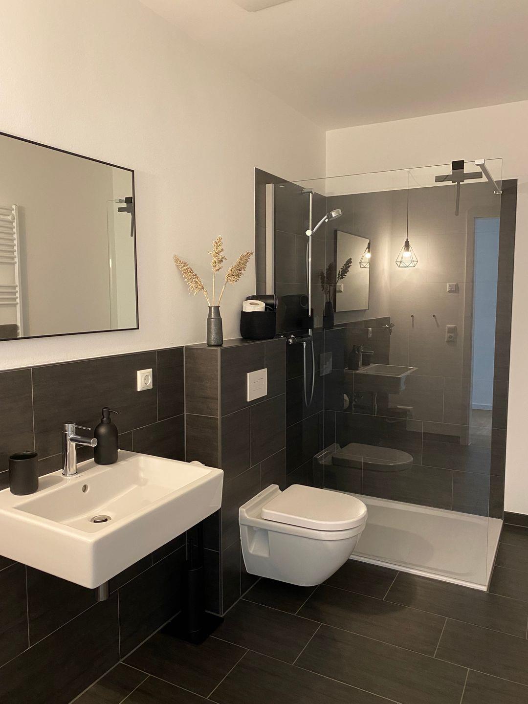 Das moderne Badezimmer mit Fußbodenheizung und großer Dusche hat eine Handtuchheizung und ausreichend Ablagemöglichkeiten für deine persönlichen Kosmetikprodukte. Handtücher, einen Haartrockner und Körperpflegeprodukte bekommst du von uns gestellt.