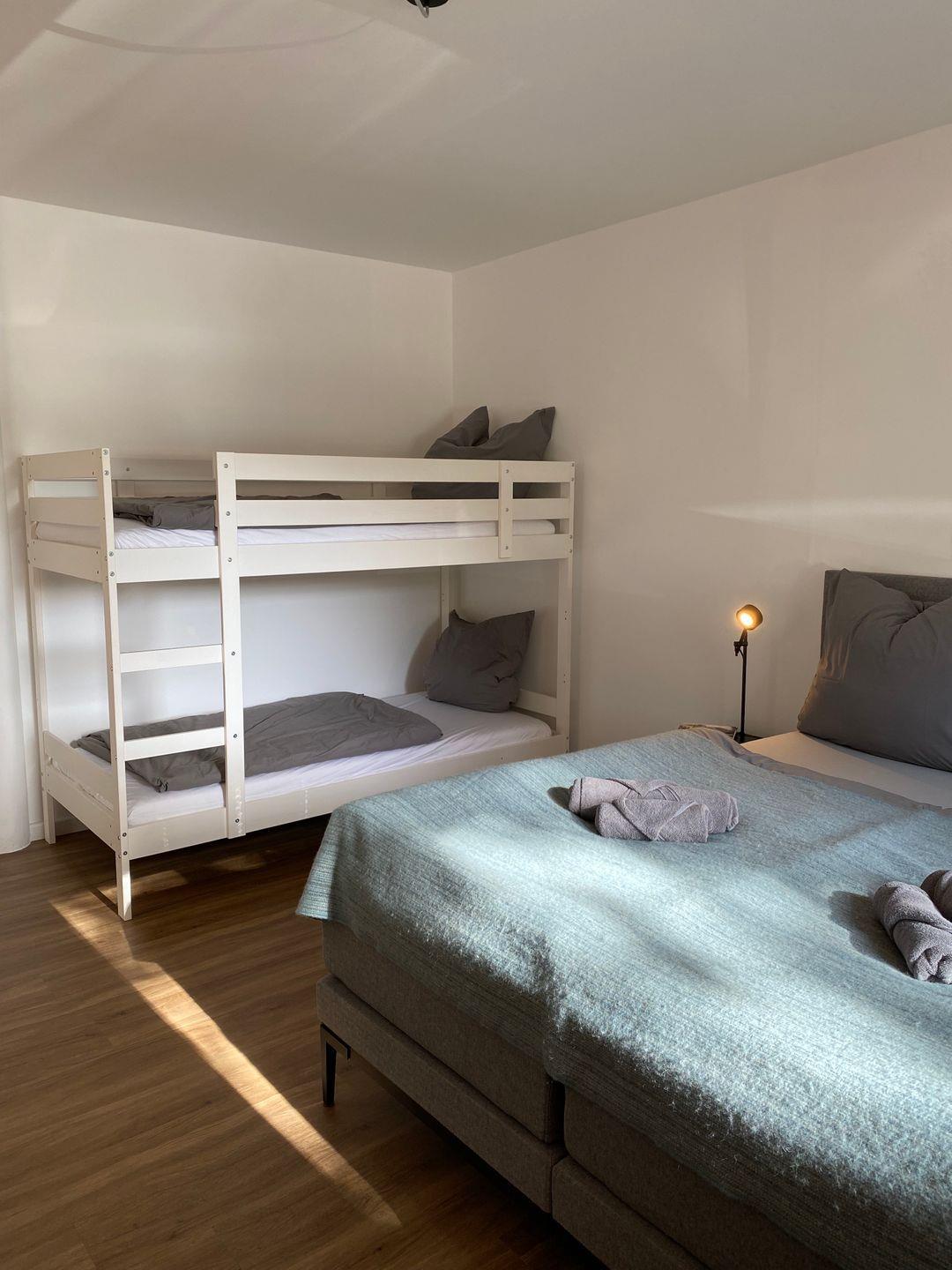 Du schläfst im separaten Schlafzimmer in einem hochwertigen Boxspring-Bett (160 cm x 200 cm), für das wir dir die Bettwäsche zur Verfügung stellen. Im selben Raum kannst du bis zu zwei Kinder in einem Etagenbett (90 cm x 200 cm) unterbringen. Für einen ausgeruhten Schlaf hast du außerdem die Möglichkeit, die Fenster mit Plissees zu verdunkeln. Zudem bieten eine Kleiderstange und weitere Ablagemöglichkeiten Platz für dein Reisegepäck.