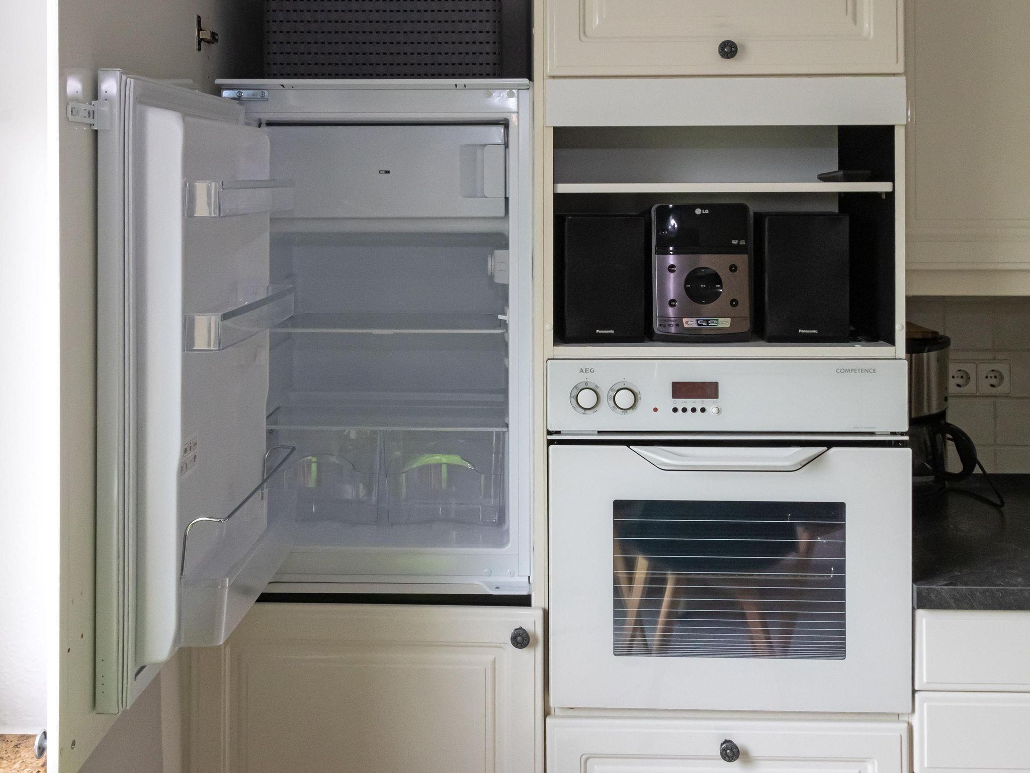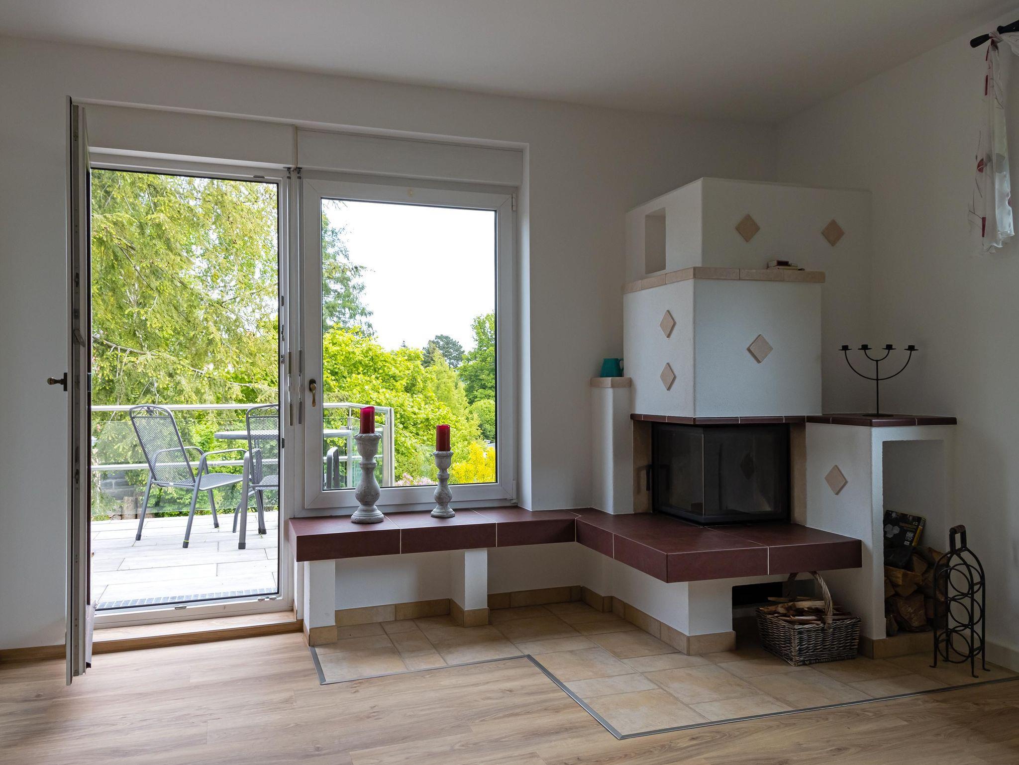 Im Erdgeschoss befindet sich eine große Küche mit Sitzmöglichkeiten, Wasserkocher, Geschirrspüler, Kühl-/Gefrierkombination, Kaffeemaschine, Toaster und einem E-Herd/Backofen sowie ein großzügiger Wohnraum mit Kamin, Schlafsofa (1,20m), begehbarer Terrasse und abgeteiltem Esszimmer.
