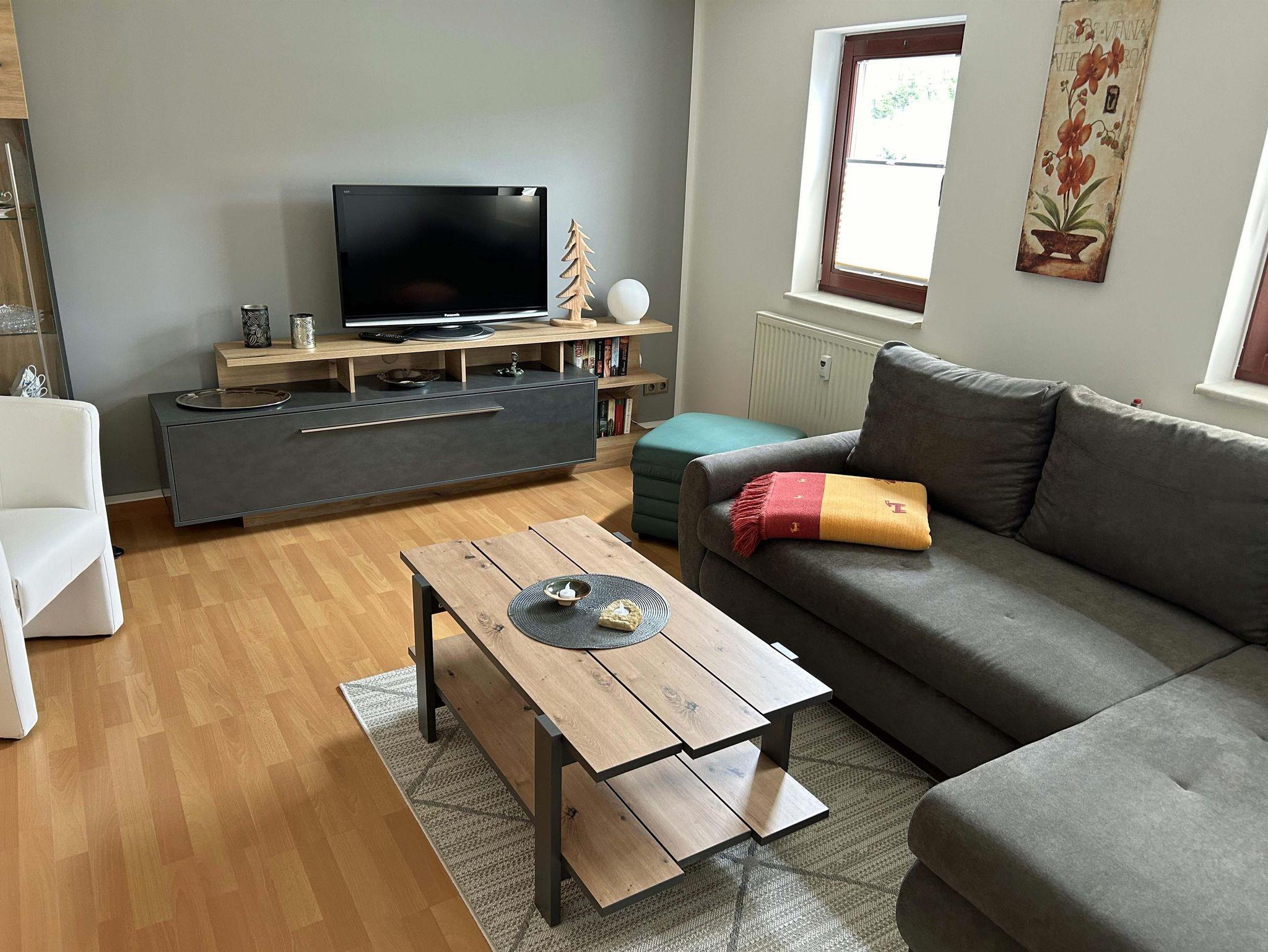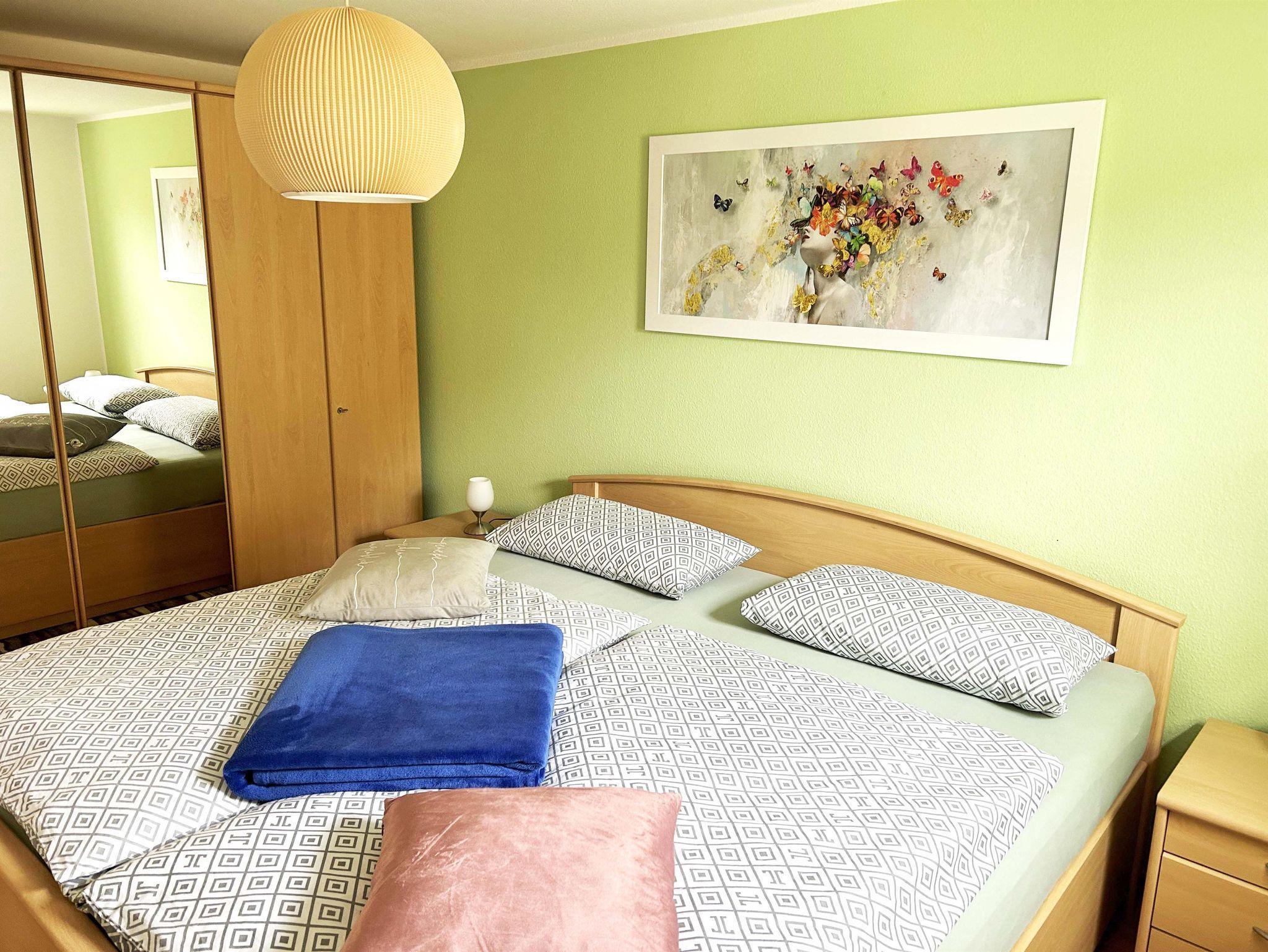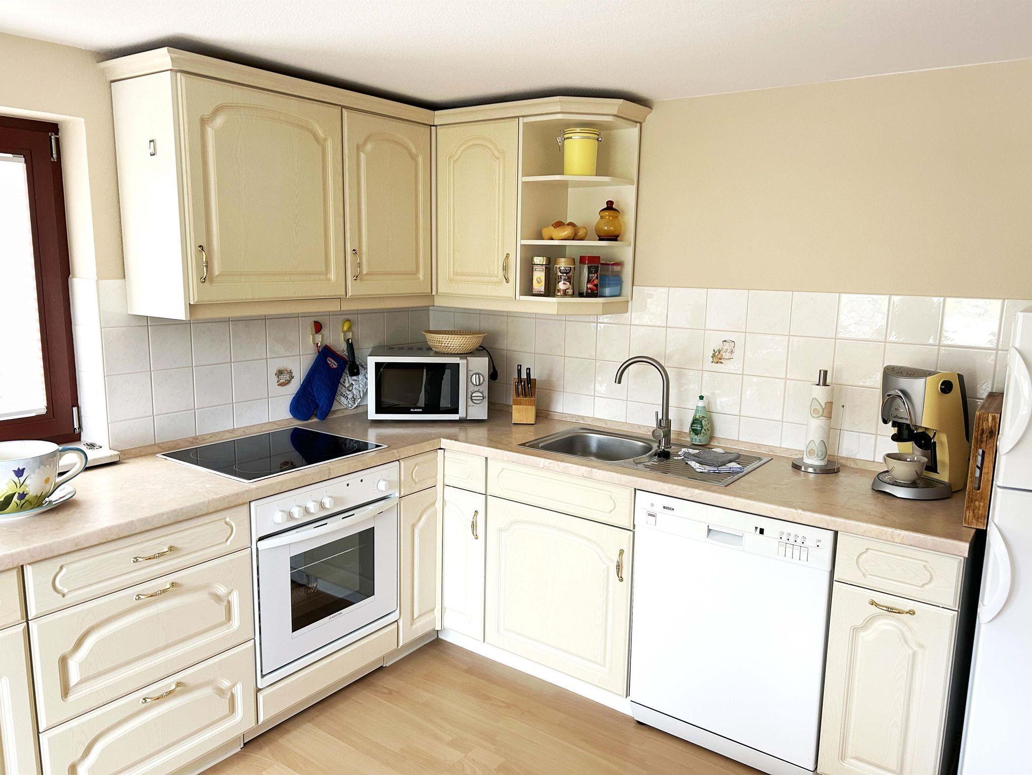 Unsere 54 m² große Ferienwohnung erstreckt sich über die gesamte 1. Etage und bietet Ihnen ein komfortables Schlafzimmer mit Doppelbett. Im gemütlichen Wohnzimmer steht eine ausziehbare Eckcouch (Schlafmöglichkeit für ein Kind bis 16 Jahre) zur Verfügung. Die großzügige Küche ist vollständig ausgestattet und verfügt über einen Geschirrspüler, einen E-Herd mit Ceranplatte, eine Kaffeemaschine, einen Toaster, einen Wasserkocher, eine Mikrowelle sowie einen Kühlschrank mit Gefrierfach.