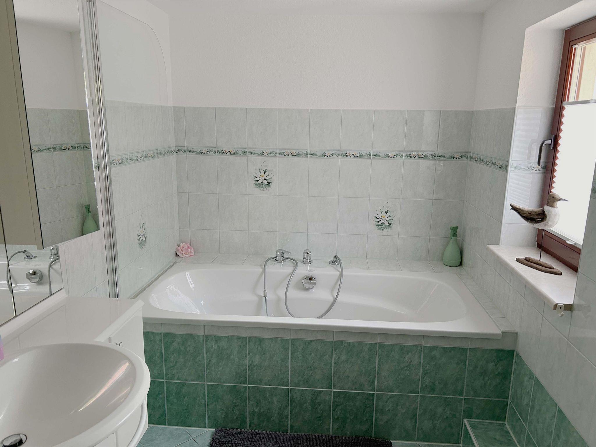 Das Badezimmer ist mit Badewanne inklusive Duschabtrennung sowie einem Waschbecken ausgestattet. Das WC ist separat.