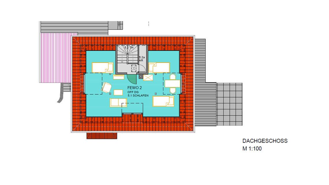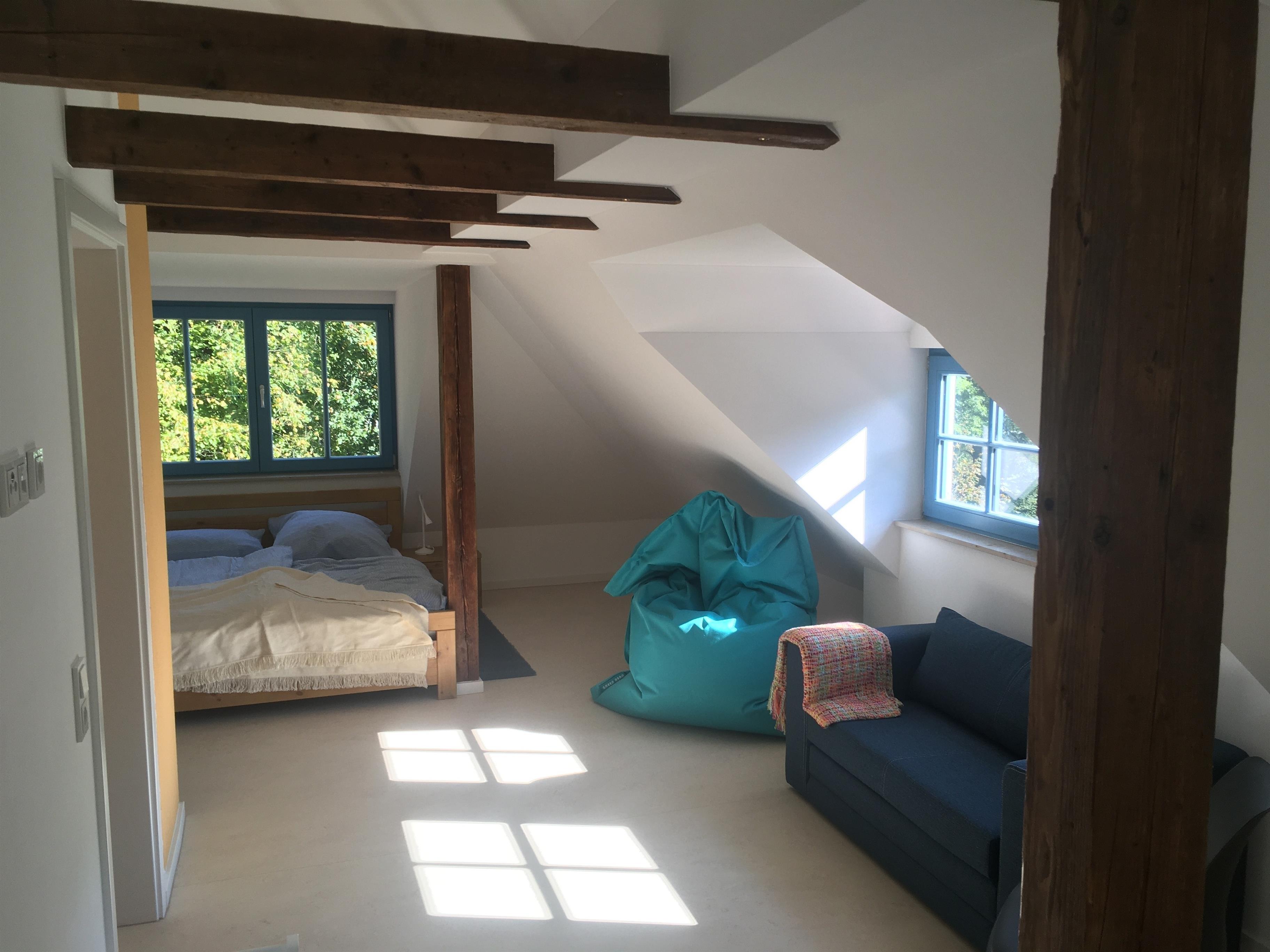 Auch diese Wohnung verfügt über getrennte Schlafzimmer. Neben dem klassischen Schlafzimmer mit Doppelbett ist das ganze Dachgeschoss für die Kinder- oder weitere Gästeschar zu einem geräumigen Schlafboden ausgebaut. Hier stehen ein Doppelbett, ein Einzelbett sowie ein Schlafsofa zur Verfügung.