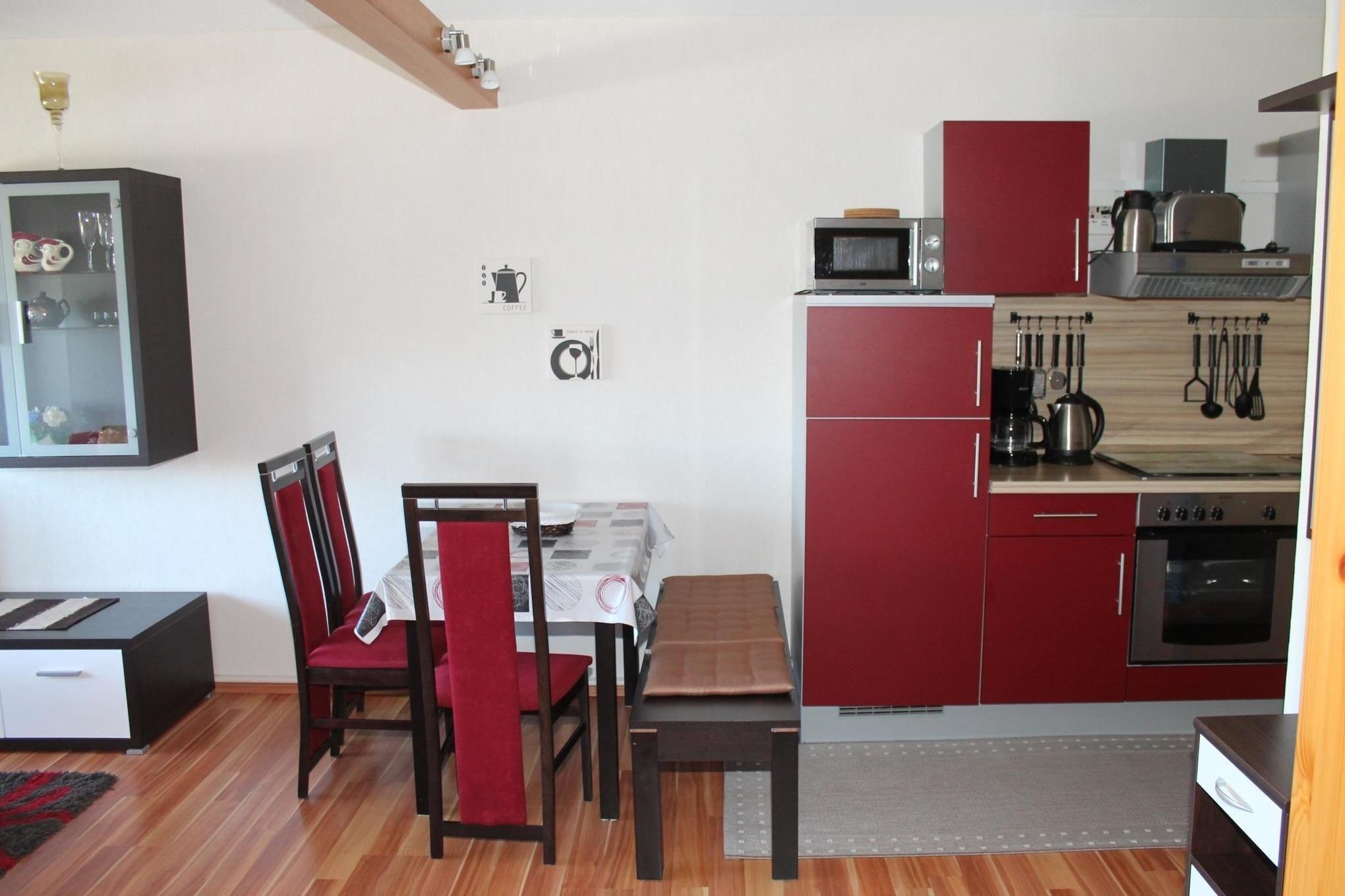 Eine Essecke befindet sich ebenfalls im Wohnbereich. Die farbenfrohe Küchenzeile ist modern ausgestattet mit 4 Platten Herd, Backofen, Kaffeemaschine, Kühlschrank mit Frostfach, sowie einer Mikrowelle.