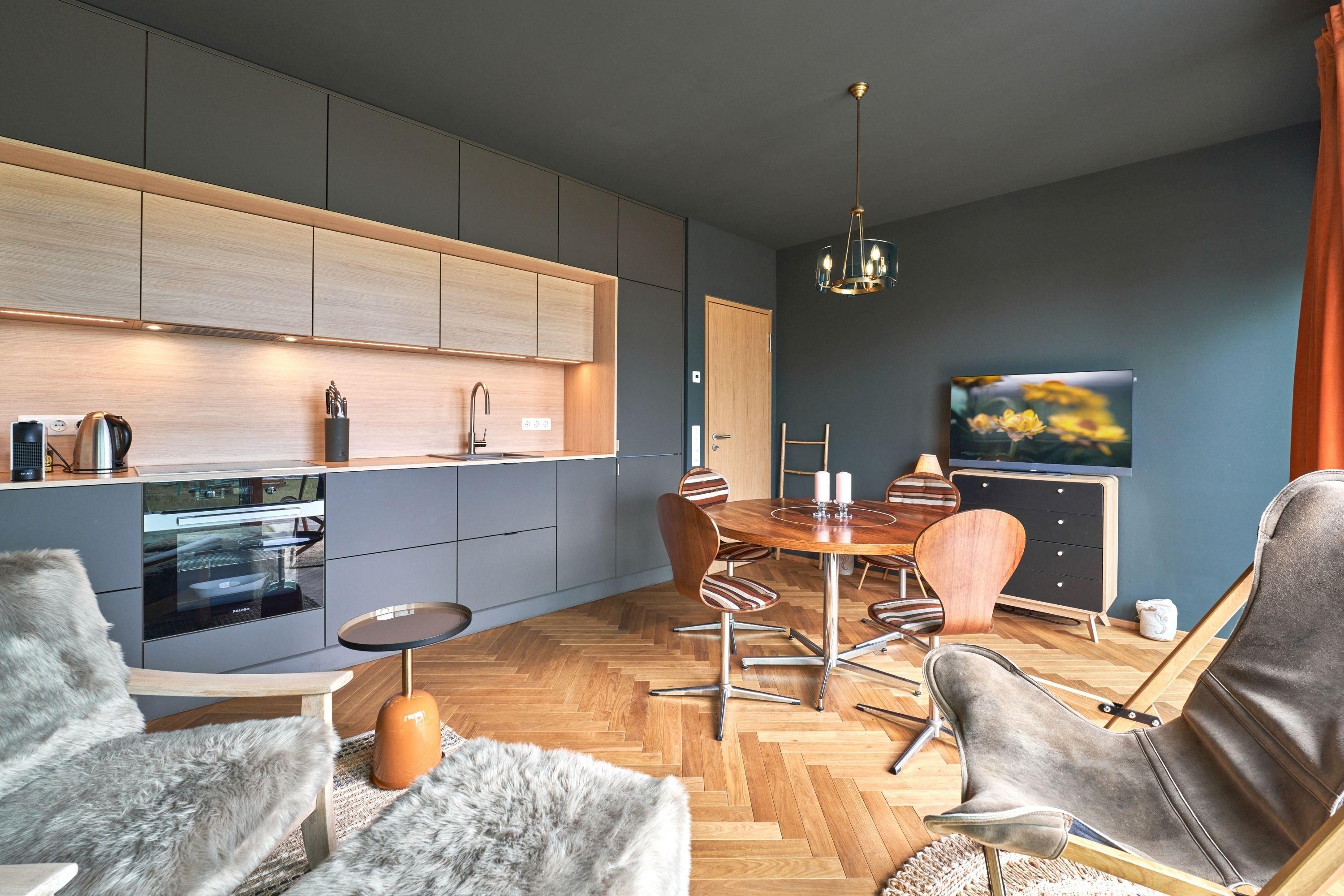 Ihre Unterkunft ist ausgesucht möbliert und hochwertig ausgestattet. Zudem werden Sie außergewöhnliche Lampen und Leuchter entdecken, die die Räume in ein gemütliches Licht tauchen. An kühlen Tagen spendet der Kaminofen wohlige wärme.
