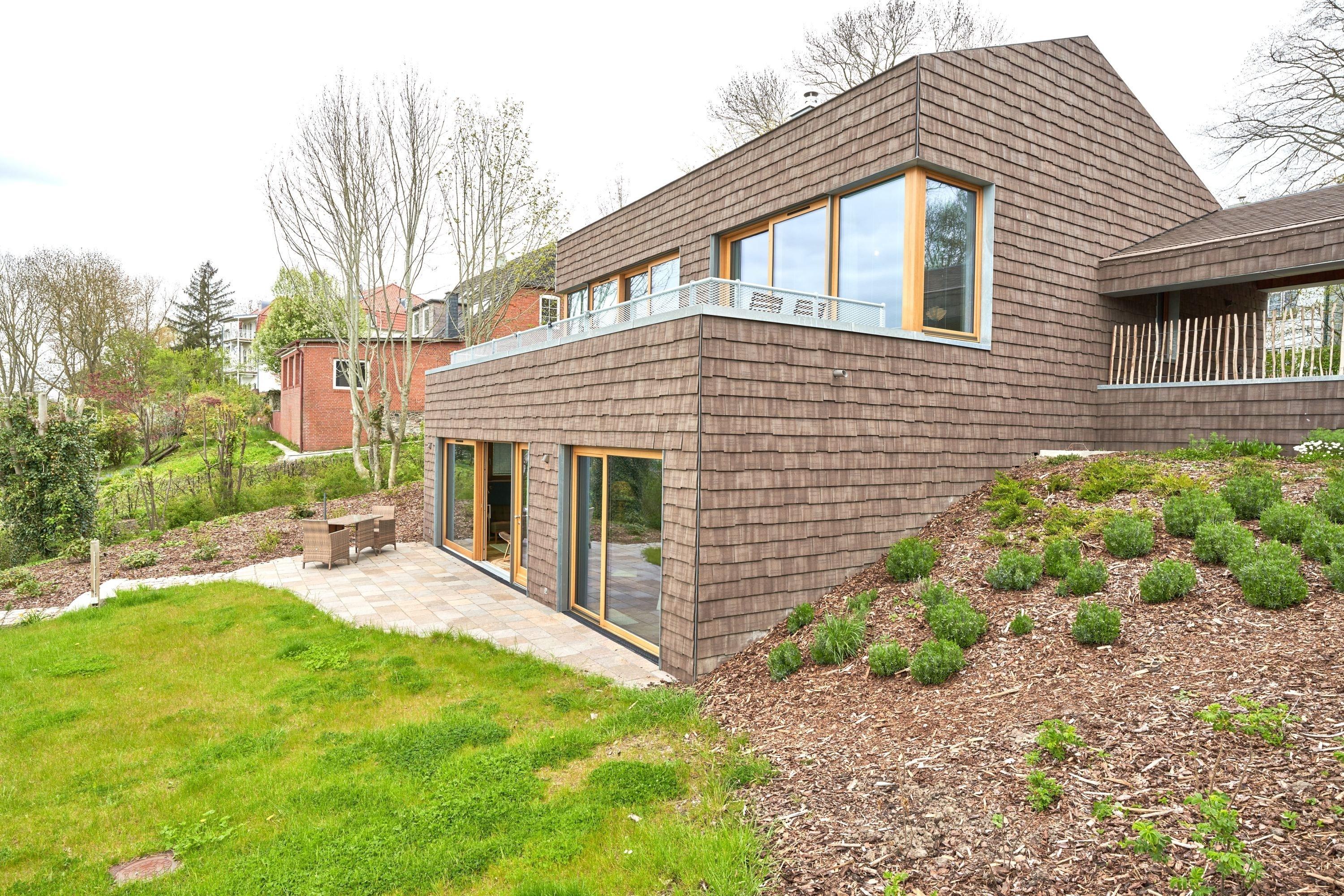 Es erinnert an einen amerikanischen Bungalow, überzogen mit einem erdfarbenen Schuppenpanzer aus französischen Tonschindeln.